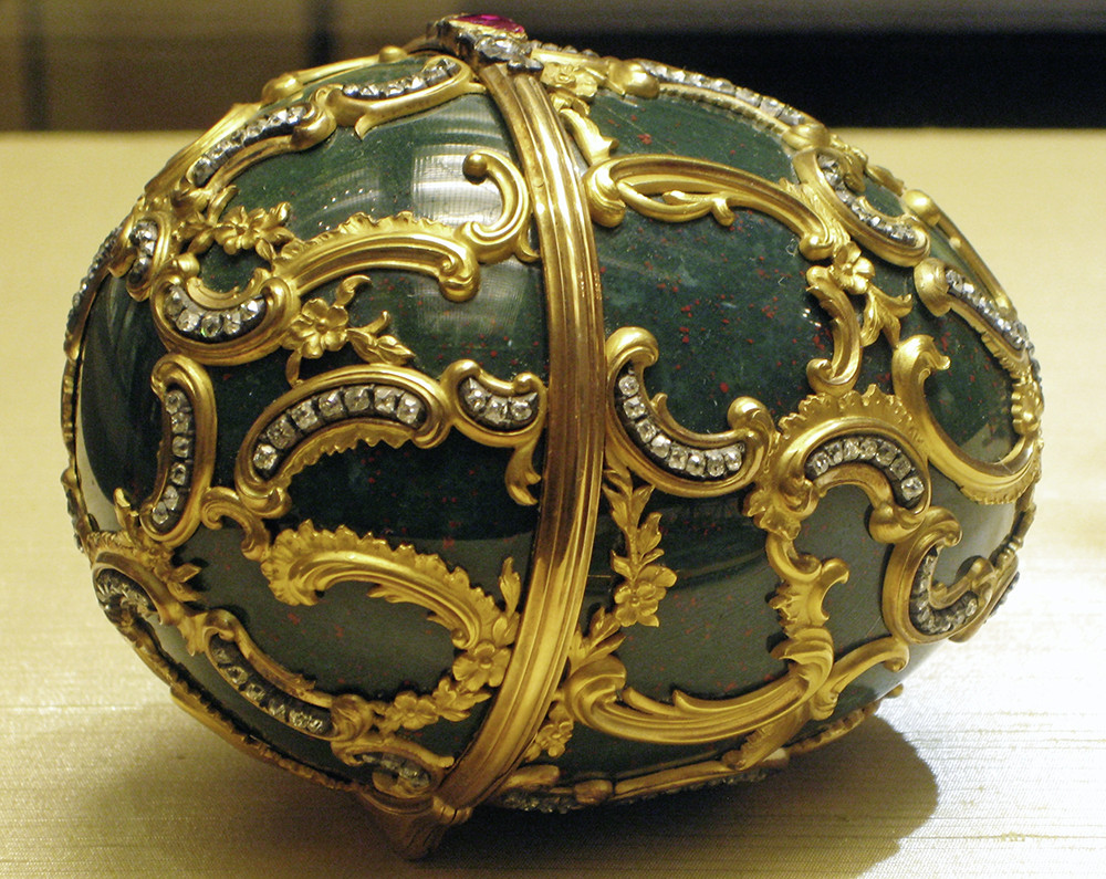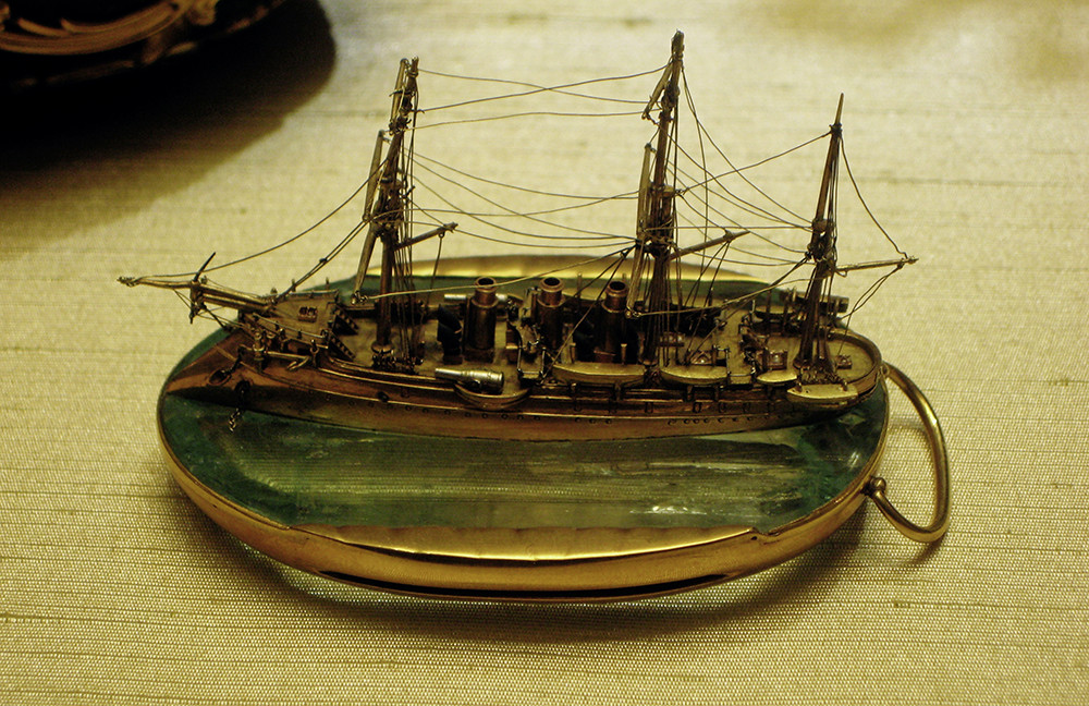 Царские сыновья путешествовали на полуброненосном корабле императорского флота «Память Азова». Крошечная копия этого крейсера из золота, платины и алмазов стала сюрпризом пасхального яйца. Укрепленный на пластине из крупного аквамарина, корабль кажется скользящим по морской воде. Ювелиры тщательно воссоздали внешний вид и оснастку: платиновые шлюпки, якоря на цепях, тончайшие золотые мачты и микроскопические буквы названия «Азов» на корме. Скорлупа выполнена из темно-зеленого гелиотропа в золотой оправе в стиле Людовика ХV. Это самое раннее пасхальное яйцо из собрания Музеев Московского Кремля.