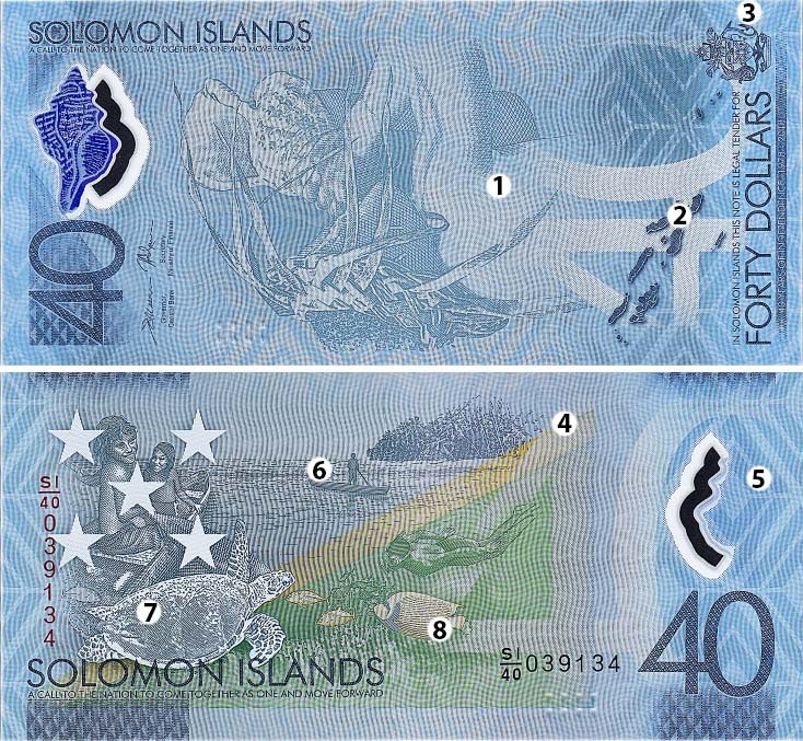 По итогам конкурса Международного банкнотного сообщества (IBNS) в 2018 году в пятерку самых красивых купюр вошла банкнота 40 долларов Соломоновых Островов. Необычный номинал обусловлен тем, что ее выпуск приурочен к 40-летию независимости государства от Великобритании. На отдаленных островах, как и несколько столетий назад, в качестве денежного эквивалента используют ожерелья из клыков тонганских летучих лисиц. Аналогами денег также являются раковины и зубы дельфинов.