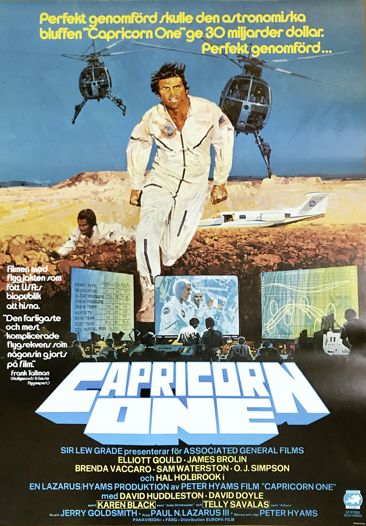 А в 1977 году в прокат вышел художественный фильм режиссера Питера Хайамса «Козерог-1». Сюжет: власти США, не в силах отправить разрекламированную экспедицию на Марс, поэтому решают сфальсифицировать видеозаписи летящего корабля и фотографии марсианских пейзажей. Астронавты не желают участвовать в инсценировке. Дабы избежать раскрытия аферы, правительство распоряжается убить их. Американскому народу объявляют, что все погибли на обратном пути с Марса. В фильме речь идет не о Луне, а о Марсе, однако это восприняли в качестве намека: дескать, киношники не могут рассказать все как есть и вынуждены прибегать к аллегориям.