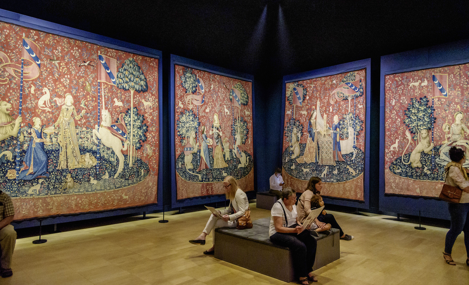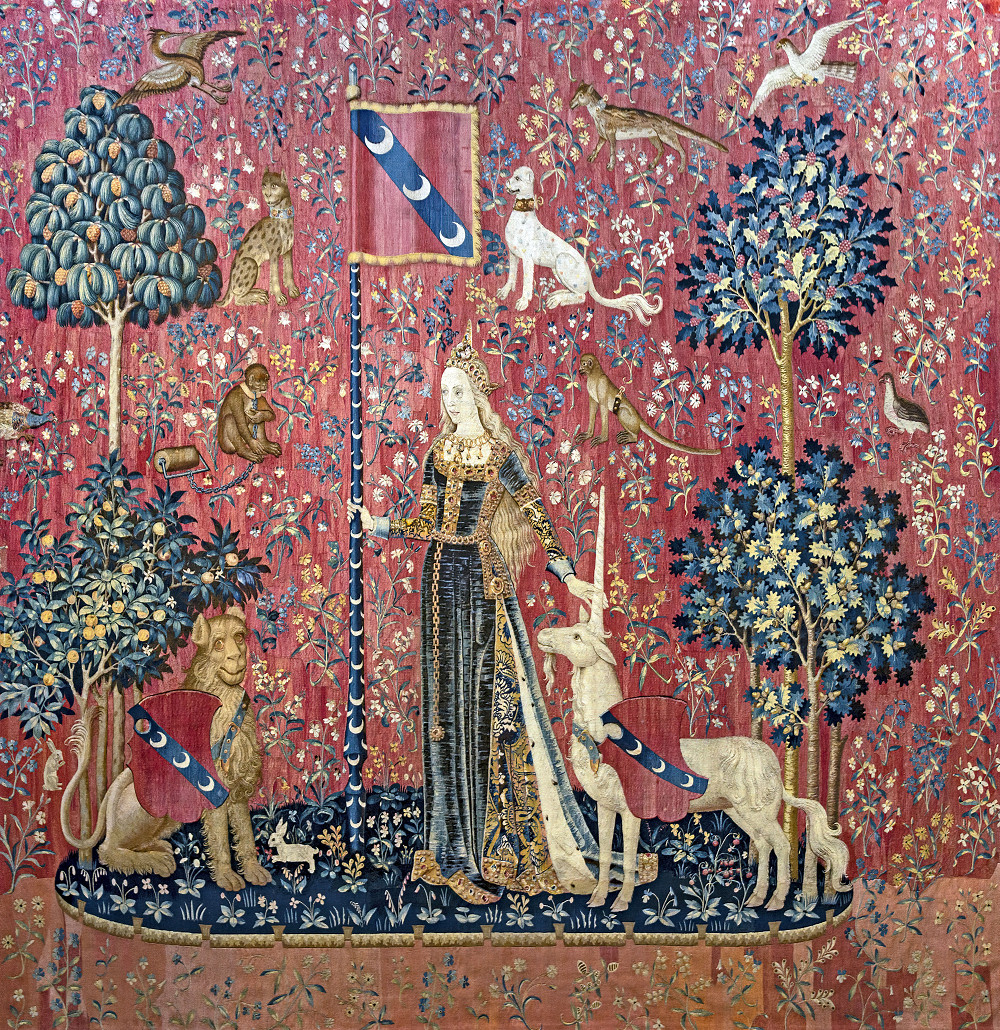 Мотив дамы с укрощенным ею единорогом стал очень популярным в изобразительном искусстве Средних веков: туда можно было одновременно вкладывать и благочестивый, и куртуазный смысл. Одно из самых знаменитых воплощений – серия шпалер из Музея Клюни, раскрывающая тему пяти человеческих чувств. Эти ковры были созданы в период расцвета в Европе искусства гобелена в одном из центров этого ремесла во Франции или Фландрии, вероятно, по парижскому эскизу. В последующие столетия шпалеры переходили от владельца к владельцу. В XIX веке общественное внимание к шедевру, хранившемуся в замке Буссак в центральной части Франции, привлекли двое писателей: Жорж Санд и Проспер Мериме; последний к тому же служил генеральным инспектором исторических памятников. В 1882 году эти шпалеры были куплены государством для Музея Клюни. И с тех пор исследователи спорят, какие тайные смыслы скрыты в этой серии изображений.