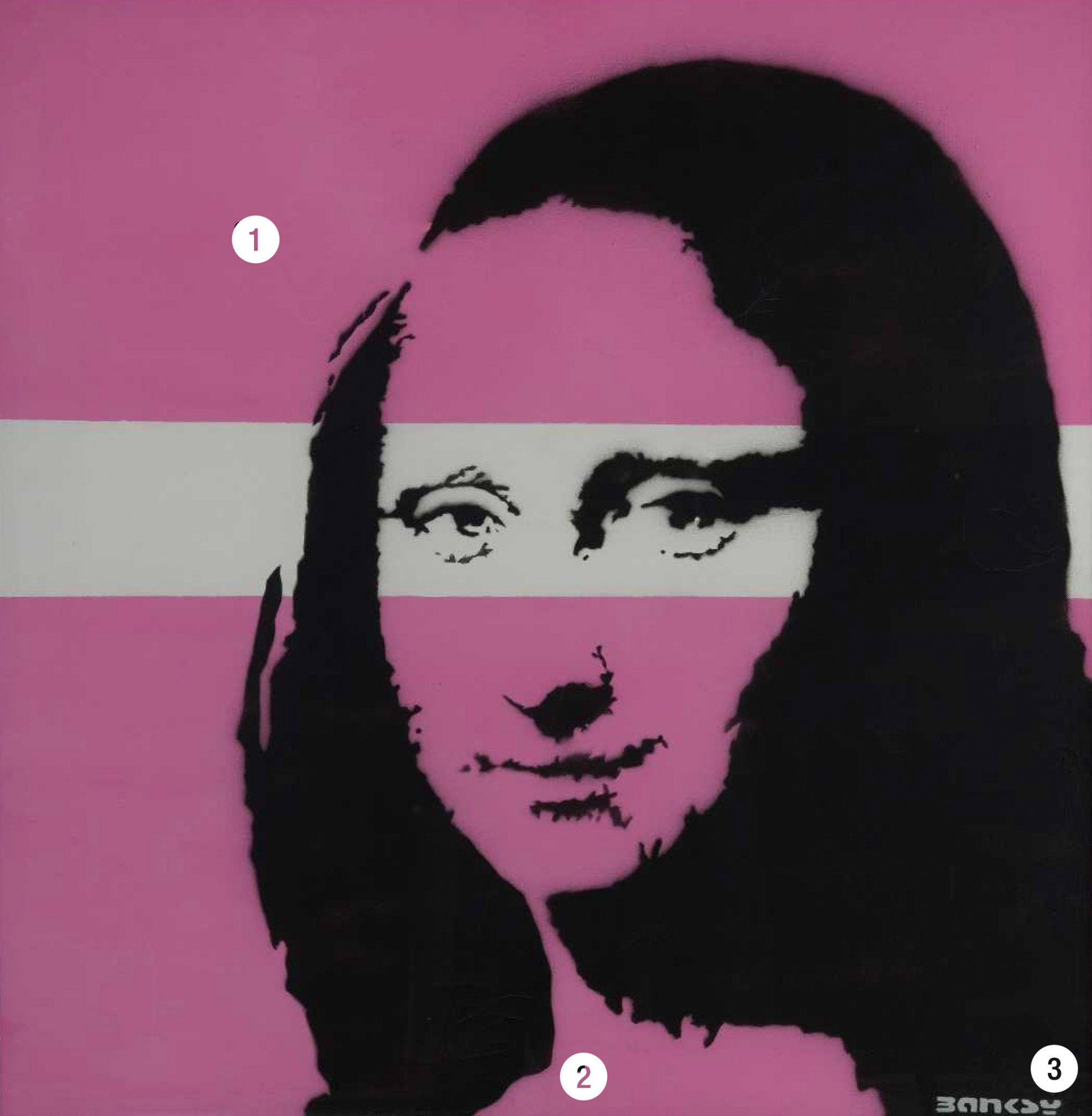 1. Техника. Изображение похоже на постер, оно нанесено на холст через трафарет краской из баллончика, как граффити на стену. Это любимая стилистика деятелей поп-арта. Самая узнаваемая дама эпохи Возрождения воплощена в актуальной манере Новейшего времени. Розовая «Мона Лиза» участвует в выставке Бэнкси, проходящей в Москве со 2 июня по 2 сентября 2018 года.