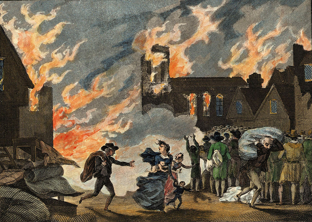 Он начался ночью 2 сентября (12 сентября по новому стилю) 1666 года в доме пекаря Томаса Фарринера на улице Паддинг-лейн, вероятно, огонь возник от искры из непогашенного очага. Пожар бушевал до 6 сентября. Потери были грандиозные. По оценкам специалистов, из 80 тысяч жителей центрального района Сити без жилья остались 70 тысяч, сгорели многие административные здания и церкви, пострадали и другие части города. Вначале предпринимались попытки обвинить в поджоге католиков, однако уже в 1667 году Королевский совет постановил, что пожар был вызван «рукой Божьей, сильным ветром и очень сухим временем года».