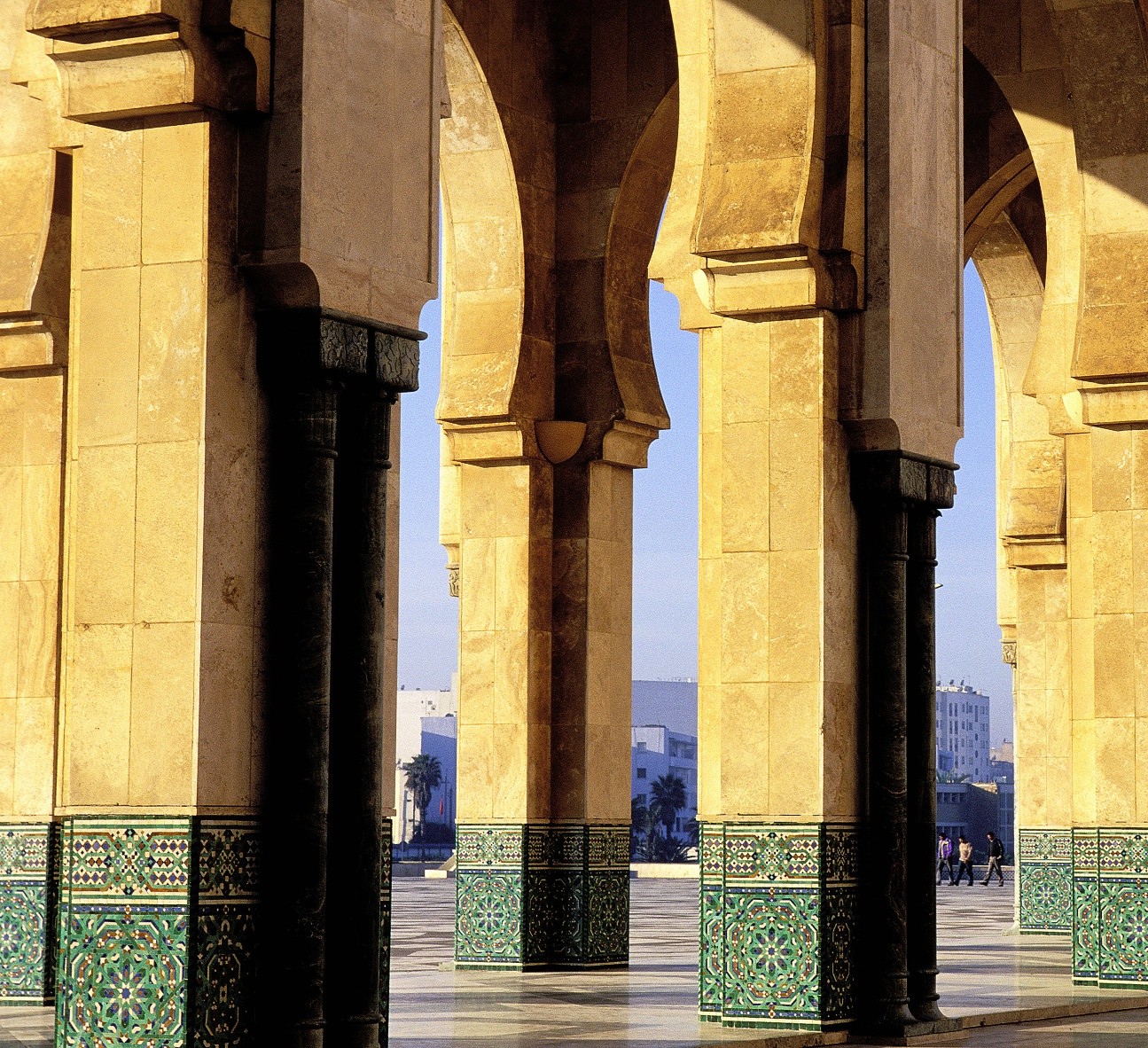 210-метровый минарет мечети Хасана II украшает мозаика из кусочков цвета морской волны, белых, синих и желтых. Мечеть построена из кремового, почти белого камня, раздвижная крыша покрыта зеленой черепицей. Площадь перед мечетью обдувается ветром с океана, солнце нагревает широкие ступени, колоннады создают тень, в которой отдыхают марокканцы. Многие в белых джеллабах.