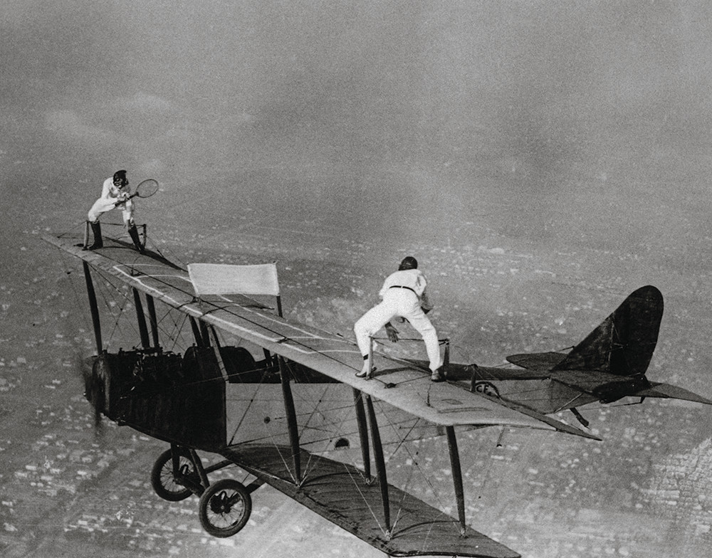Двое людей стоят на крыле летящего биплана с теннисными ракетками в руках, без всякой страховки. Это не эффектный фотомонтаж, а реальная фотография 1925 года. Глэдис Рой и Айвен Унгер, играющие в теннис на высоте более тысячи метров над землей, зарабатывали на жизнь, занимаясь винг-вокингом (от англ. wing walking – «хождение по крыльям»). Такие шоу в начале века стали одним из самых экстремальных и опасных видов развлечений в истории авиации.