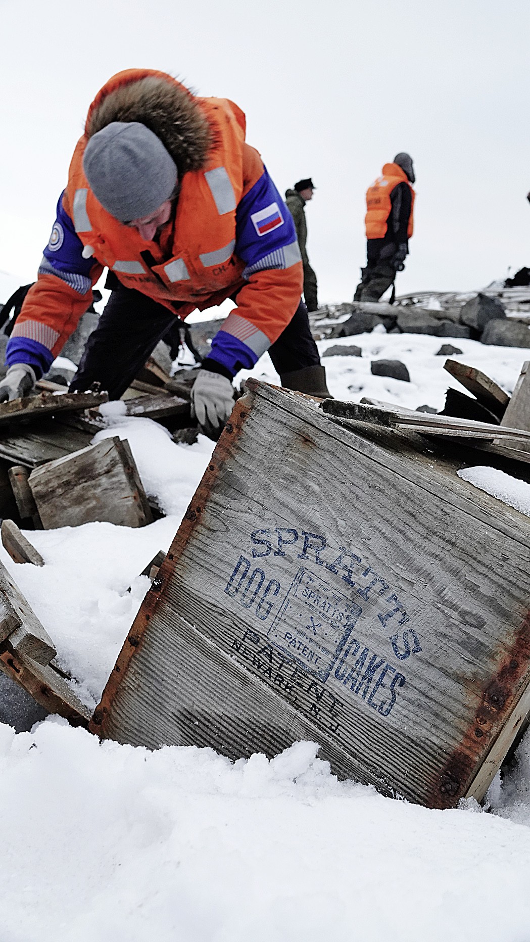 Да, мы как будто побывали в замороженном времени. Идешь по ледяной пустыне, видишь следы костровищ столетней давности… Интересно сравнивать дневниковые записи и реальность. Например, Альбанов писал, что они нашли на острове Белл кости огромного кита. Мы увидели такие же и несколько позвонков, нанизанных на большую кость. Последнее явно сделали люди. А на севере архипелага обнаружили заброшенную базу экспедиции Болдуина. Американцы серьезно подготовились к штурму полюса: привезли 400 лаек, 15 низкорослых сибирских лошадок. Мы нашли собачьи черепа и конскую челюсть. В хижинах до сих пор стоят бочки и ящики с припасами: галеты, консервы, чай, кофе.