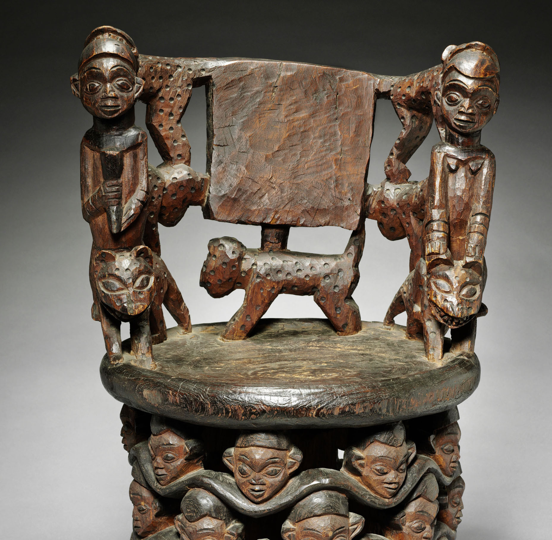 Вечером нас ждал прием у короля, на частной половине дворца. Его величество Наянг Тукам принимал нас по-домашнему, в гостиной, где традиционные предметы дворцового декора соседствуют с огромным телевизором и многочисленными фотографиями. Разговор быстро перешел к проблеме сохранения традиции – вопрос особенно актуальный, поскольку тяжелое колониальное прошлое страны существенно отразилось на художественном мире западных королевств. Даже в тронных залах и святилищах предков практически не осталось скульптур и архитектурного декора, созданных до 1950-х годов: огромная часть наследия была вывезена в европейские страны. Только в музеях Германии хранится более 40 000 предметов искусства Камеруна, и огромная их часть – именно из региона Грассфилдс. В период германской колонизации европейцы сознательно разрушали политическое и культурное единство традиционных общин, лишая их значимых культовых предметов: вывозили или уничтожали маски, скульптуры, барабаны. Господство колонизаторов стало для населения этой страны травмирующим событием; это ясно видно и в устном историческом предании, и в книгах камерунских авторов. Королевства на западе Камеруна пытаются восстановить утраченную традицию и заказывают резчикам новые предметы власти и статуса. Создавая троны, церемониальные табуреты, фигуры предков и обрамления порталов, мастера ориентируются на немногие сохранившиеся старые образцы и активно используют мотивы и скульптурные стили соседних этносов. Правда, многие ныне недоступные материалы приходится заменять более простыми: слоновьи бивни – деревом, коралловые бусины и богатый стеклярусный декор второй половины XIX века – непритязательным китайским бисером, а шкуры леопардов – фабричными тканями.