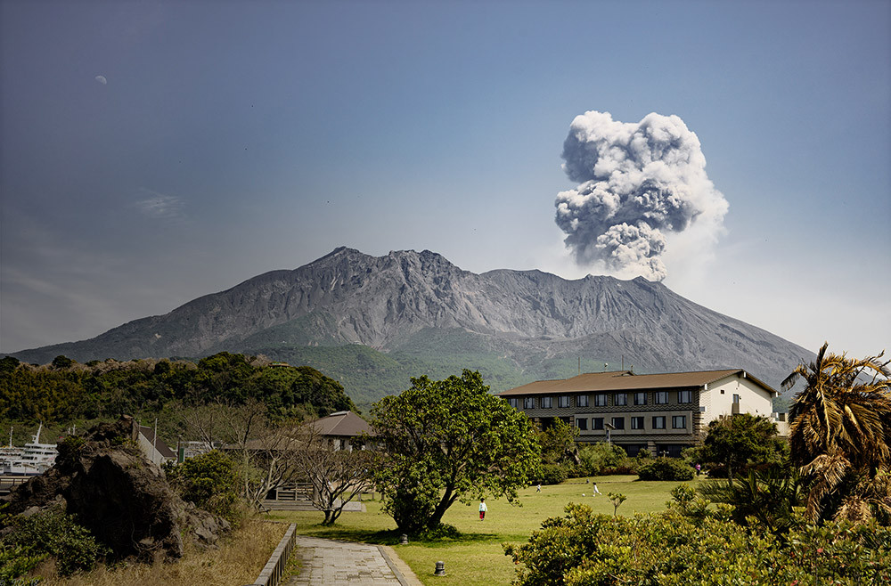 Вулкан с романтичным названием «Остров Сакуры» расположен на полуострове Осуми острова Кюсю. Дело в том, что раньше вулкан находился на отдельном острове, но после извержения 1914 года оказался соединен с Кюсю застывшими потоками лавы. С 1955 года извергается почти постоянно.