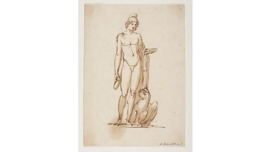 Из копенгагенского Музея Торвальдсена, храма, усыпальницы и надгробного памятника главного датского гения в области изящных искусств, привезли только рисунки. Причем «станковых» рисунков, то есть законченных, отделанных до блеска акварелью с белилами и предназначенных для показа и подарка, здесь всего два. Один — суровый профильный «Автопортрет» в духе скульптурно-рельефной графики другого немецко-датского гения, Асмуса Якоба Карстенса, обожаемого Торвальдсеном — и не им одним. Одинокий бунтарь Карстенс, прославившийся незадолго до смерти в Риме грандиозными рисунками — в том числе «Пространством и Временем», в котором современники увидели иллюстрацию к идеям Канта, над чем изрядно потешались в переписке Гёте с Шиллером,— умер от чахотки во цвете таланта, и лишь тогда Гёте пересмотрел свое отношение к ушедшему художнику-интеллектуалу, найдя в нем нечто близкое собственному пониманию