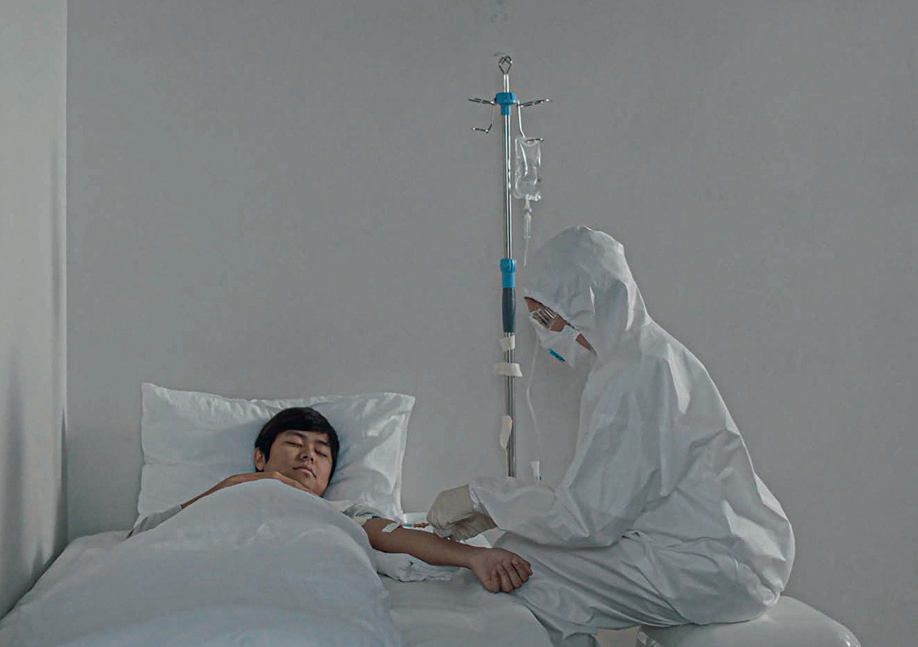 Петербург, эпоха коронавируса. На чистой лестничной площадке в светлых тонах звенит звонок, открывается дверь, а перед ней на кафеле — бездыханный курьер в маске (Нурбол уулу Кайратбек), рядом лежит аккуратно снятая юношей перед обмороком сумка службы доставки. Из-за двери щелкает затвор фотоаппарата, вспышка, титры, склейка — и тело уже по другую сторону двери, хозяйка в полной противовирусной защите принимает врачей, которые должны взять тест на COVID-19.
