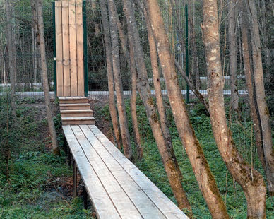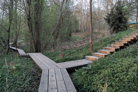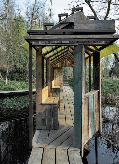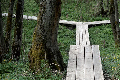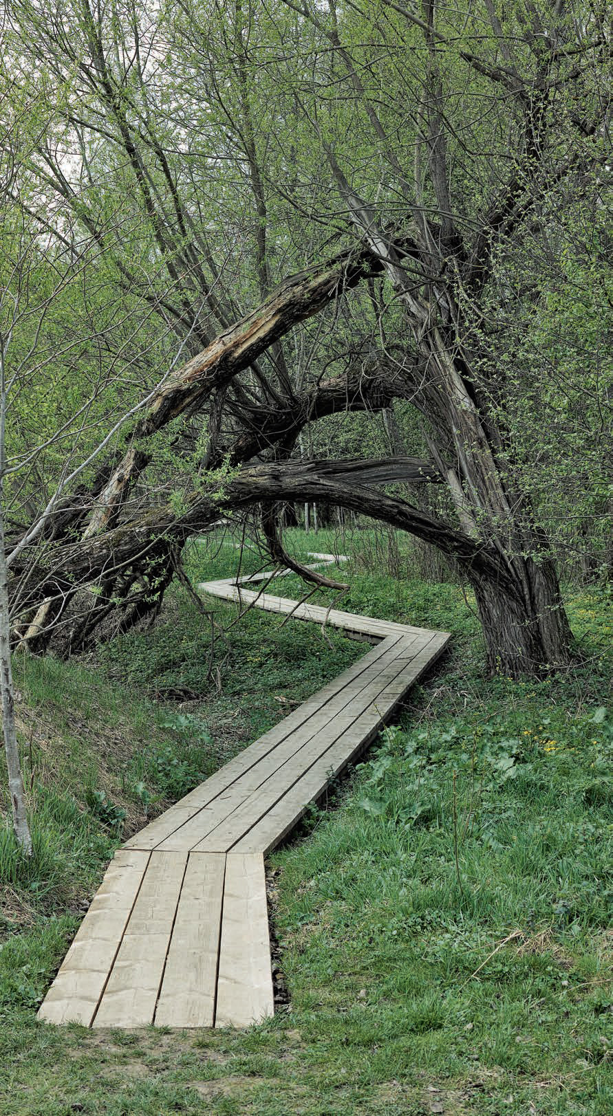Эта иномирность — главная тема. Парк прежде всего состоит из проложенной над болотом узкой деревянной дорожки-мостика, она висит над поверхностью на высоте примерно полуметра и нигде его не касается, вы идете по болоту, но не можете до него дотронуться. При подчеркнуто неумелой рукодельности — старые доски, черный металл стоек — в переживании пространства есть что-то от виртуальной реальности: вы можете ее видеть, можете в ней передвигаться, но не можете ее коснуться. Есть только одно тайное место, лестница, как в подпол, по которой можно спуститься и приложиться к воде, оставив на ней мгновенно исчезающий след руки. Это пространство медитаций, медленных, тянущихся минутами прогонов взгляда по текущей воде, как в «Сталкере» Тарковского, который, мне кажется, повлиял на образ. Болото тут живет как святыня. В христианской иконографии есть канонический сюжет «Noli me tangere» — «Не прикасайся ко мне» (это первое явление Христа Марии Магдалине, когда она видит его воскресшим и хочет коснуться рукой, а он запрещает). «Не прикасайся ко мне», «не смей меня трогать» — такова идея парка. Но не единственная.