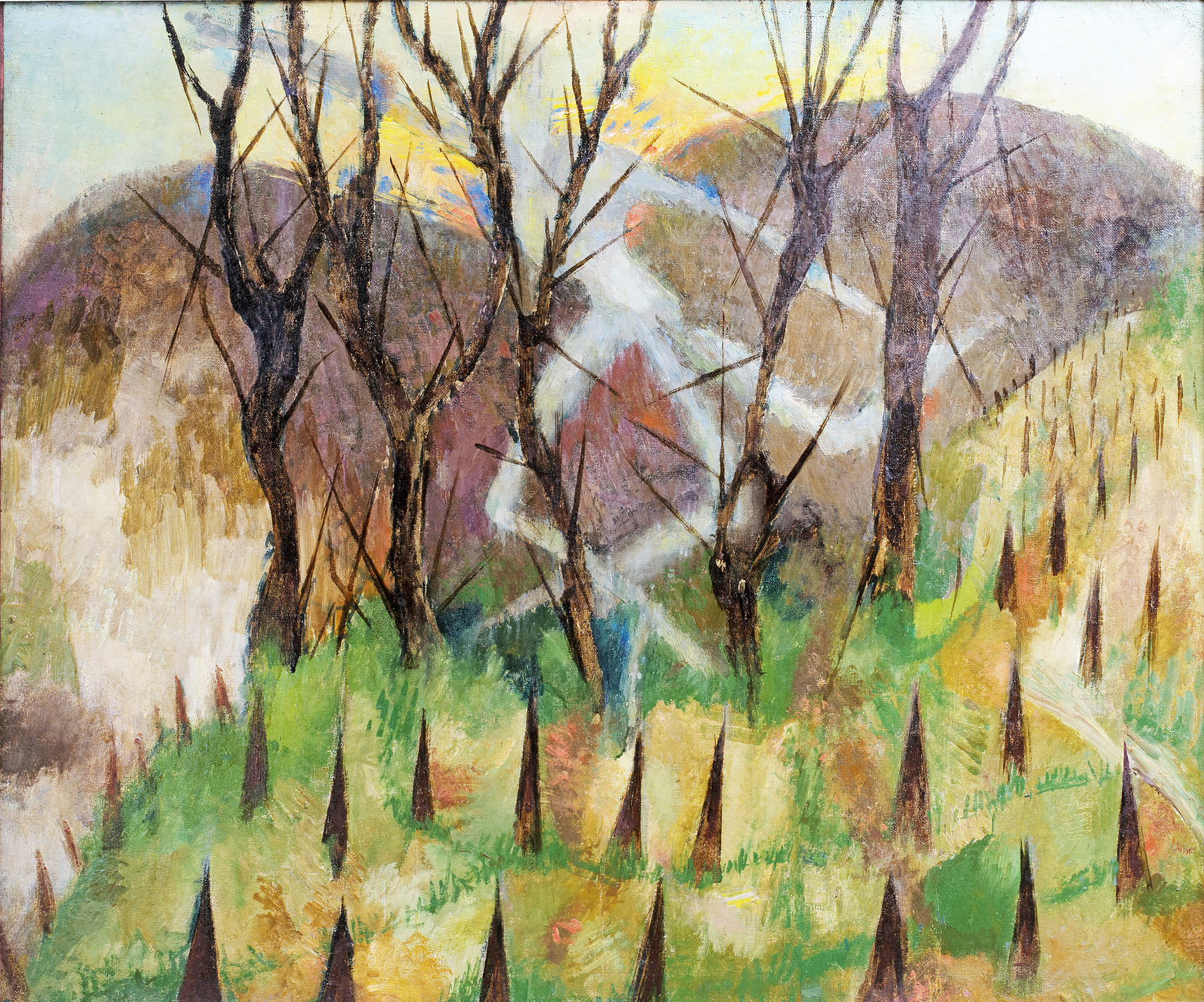 Константин Эдельштейн (1909–1977) тоже бросил ВХУТЕМАС-ВХУТЕИН в 1930-м, протестуя против травли учителей. Подвизался в книжной иллюстрации и монументальных росписях, обладал большим педагогическим даром, но, не получивший диплома, официально преподавать не мог — вся его обширная московская школа, которую он в 1960-е годы приобщал к вхутемасовской традиции, была, так сказать, воскресной. Эдельштейн к тому же собирал и сохранял картины своих друзей-однокашников, но его собственная ранняя живопись почти вся погибла во время войны — можно лишь воображать, как хороша она была, глядя на крошечный этюд «Военные огороды» 1943 года.