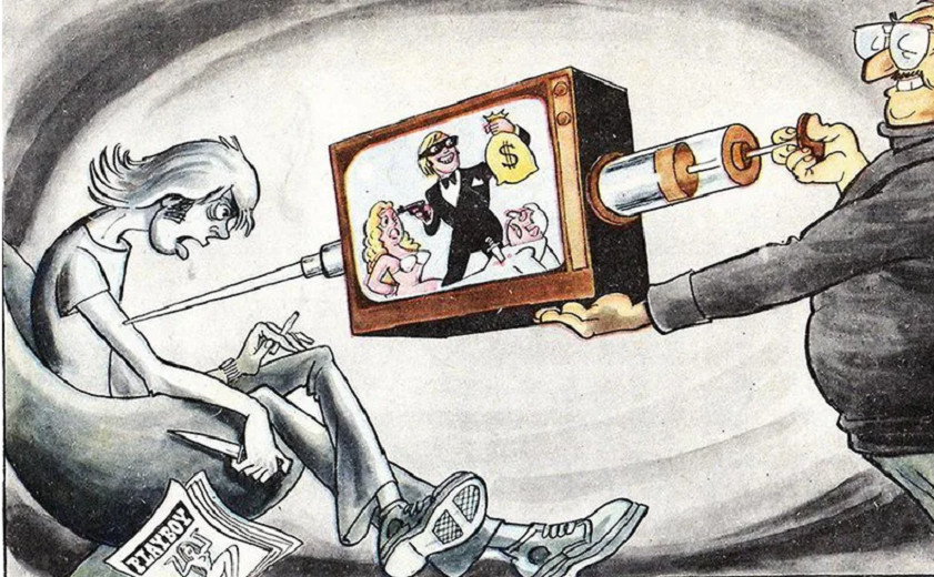 Именно так. И была масса промежуточных звеньев. Например, в этой культуре создавались симулякры популярных жанров. Пословицы, поговорки, частушки. Мы знаем, что частушка — это по определению неподцензурный жанр. «Мой миленок…» — и дальше какой-нибудь трехэтажный мат. А тут такое: «Мой миленок ошалел, / Ничего не кушает: / Трубки на уши надел — / Радио он слушает». Или: «У колхоза, у колхоза / Все, как есть, сбывается, / У колхоза счастье возом / Так и поднимается». Такие тексты создавались в огромных количествах. Не было года, чтобы не издавались «Народные мудрости», сборники народных пословиц и поговорок, где народных было 5%, а 95% были выдуманы какими‑то агитпроповскими частушечниками. Откуда люди получали информацию, скажем, в 1930‑е годы? Тогда даже радио не по‑ лучило еще широкого распространения, в маленьких городках и деревнях его не было. Все вращалось вокруг газет, приезжающих лекторов, политинформаций и тому подобных вещей. А когда обычный житель страны открывал газету, первое, куда он смотрел,— фельетон и карикатура. Мой соавтор Наталья Джонссон-Скрадоль, написавшая среди прочего главу о карикатуре, обратила внимание на интересную вещь: советский читатель того времени не видел ни портретов, ни фотографий за‑ рубежных политических деятелей. Их представляли исключительно по карикатурам Кукрыниксов или Бориса Ефимова, где эти деятели могли быть изображены в виде петуха или свиньи. Визуально с ними знакомились через карикатуры, а содержательно — через политические фельетоны того же Давида Заславского.