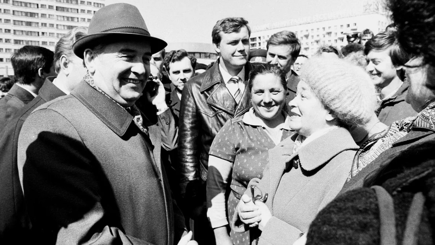 Май 1985-го, программа «Время», сюжет о визите нового генсека в Ленинград. В кадре — выверенный до миллиметра ритуал: серая шеренга у трапа, возложение венков, встреча с трудовыми коллективами. За кадром — древесно-стружечный брежневский речекряк («трудящиеся выразили поддержку внешней и внутренней политики партии»). И тут внезапно легкий сбой — то ли генсек слишком живо жестикулирует, то ли у людей, его окружающих, недостаточно постные лица, и кто-то уже кричит из толпы: «Будьте ближе к народу!», а он в ответ: «Куда уж ближе!» И разводит руками и широко-широко улыбается.