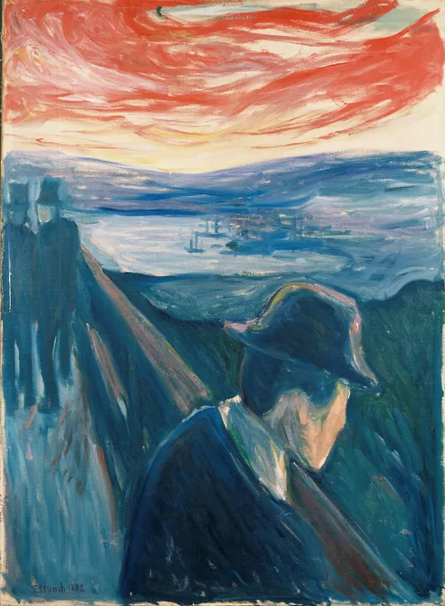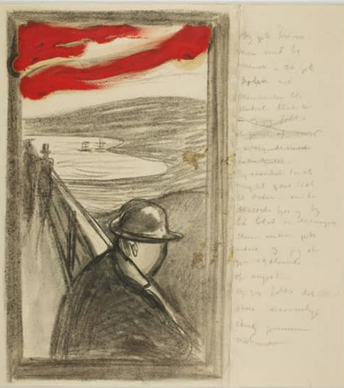 2. Из текста родился образ. Дневниковая запись не давала Мунку покоя, и он делал множество набросков, сопровождая их текстом записи и строфами из написанного на ее основе стихотворения. В конце концов из них получилась картина «Настроение на закате» (позже переименованная в «Отчаяние»). Ее пейзаж и второй план — красное небо, извилистый ландшафт фьорда, деревянные перила и удаляющиеся фигуры людей — напоминают «Крик», но отличается центральная фигура — мужчина с непрорисованным лицом стоит в профиль к зрителю. Эту картину Мунк впервые показал осенью 1893 года, тогда же он сделал вторую версию: на ней уже появилась смотрящая прямо на зрителя фигура, лишь отдаленно напоминающая человеческую.