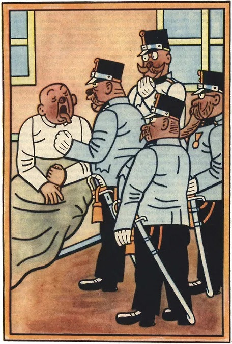 Но психушка не верит Швейку и объявляет Швейка хотя и дегенератом, но симулянтом. Судите сами: тот сам рвется на фронт и громко выражает свои патриотические чувства в поддержку государя-императора. Разумеется, вся Прага увешана лозунгами, типа «умереть за отчизну доблестно и почетно», но чтобы человек повторял такое, так сказать, частным образом — в такую меру идиотизма никакой врач поверить просто не готов.