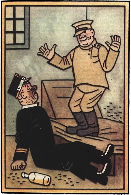 Нельзя не заметить, что цинизм выигрывает по всем статьям. Самое гармоничное время, которое выпадает Швейку в романе,— время, проведенное в денщиках у непросыхающего фельдкурата. «"Молитвенник у меня на кухне. Швейк! Принесите его сюда и откройте на третьей странице". Швейк ушел на кухню, и оттуда послышалось троекратное хлопанье раскупориваемых бутылок». Все происходящее с ним на этом ответственном посту Швейк при полном согласии и сотрудничестве своего непосредственного начальника превращает в увеселительное мероприятие — от добывания денег в долг до обмана кредиторов и спаивания коллег.