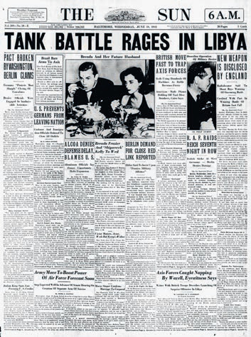 18 июня 1941 года самое заметное место на первой полосе американской газеты The Baltimore Sun было отведено фотографии светской львицы Бренды Фрейзер и футболисту Джону Симмсу Келли — популярная пара, за отношениями которых американцы следили последние месяцы, наконец объявила о помолвке. Остальные тексты так или иначе касались войны.