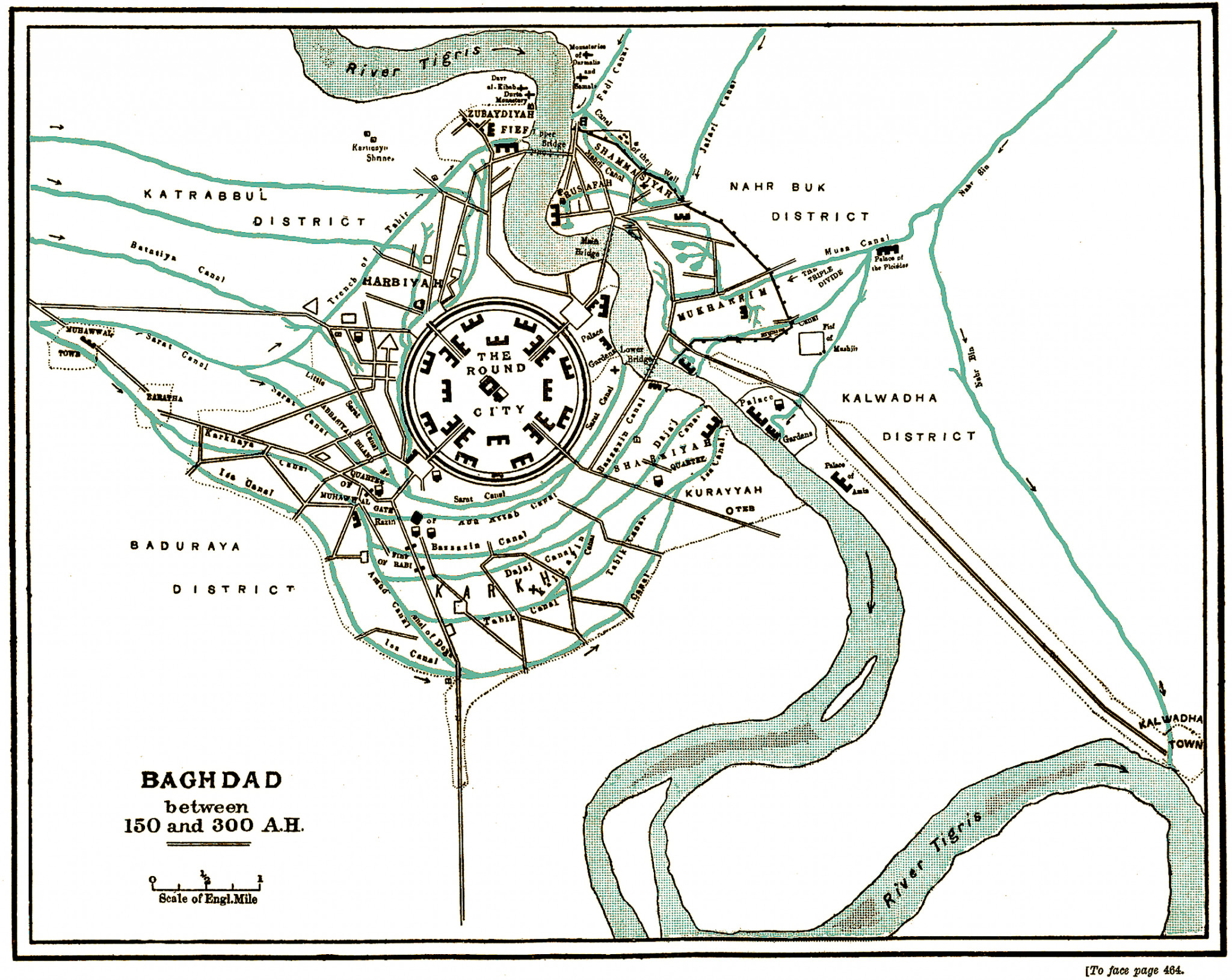 Город Багдад (Madinat al-Salam, «город мира», в смысле центр мироздания) был основан халифом аль-Мансуром (Абу Джафар Абдуллах ибн Мухаммад) в 762 году. На голом месте, с нуля. Город не сохранился, но он известен по описаниям и изображениям.