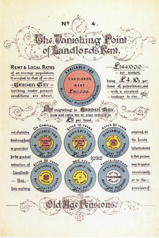 Далее следуют коттеджи жителей с их участками, четвертый парк, потом производственная зона и сельскохозяйственные угодья. Поселение нарисовано в форме концентрических кругов. В городе должно быть 32 тысячи жителей, предлагается не один город, а новая система расселения, когда подобными структурами покрыта вся страна. Этот план занимает не более четверти брошюры, три четверти — это более или менее подробный бухгалтерский расчет необходимых средств для строительства города-сада и определение суммы взноса, который должен внести каждый его будущий житель.