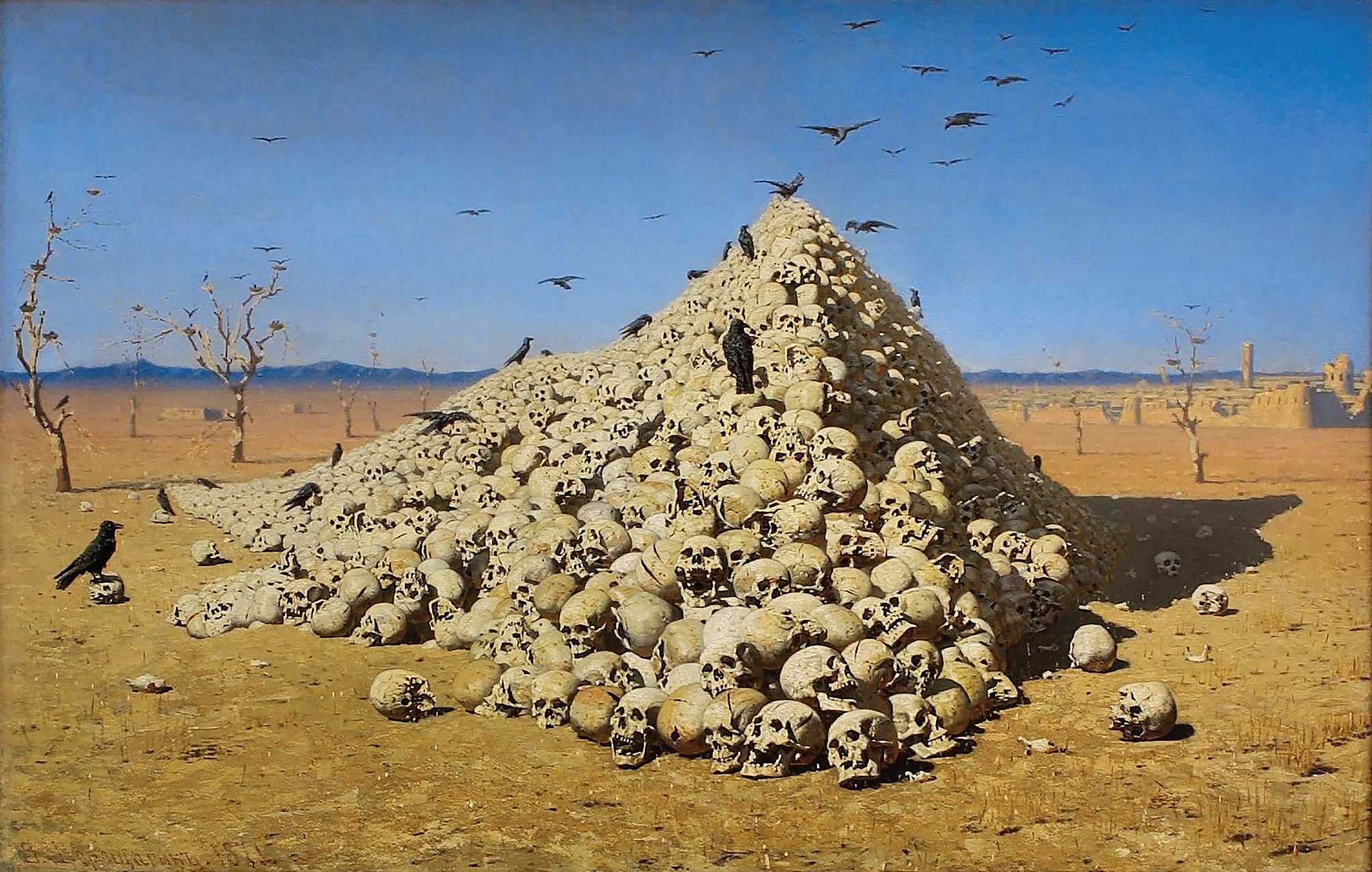Верещагин — одновременно главный баталист и главный пацифист в истории русского искусства. Сам отличавшийся боевой храбростью, он открыл русской культуре тот факт, что война — не славный подвиг, а разрушение и смерть — смерть не героическая, остающаяся в веках, а анонимная и бесславная. Об этом — «Апофеоз войны». Картина — смысловой центр «Туркестанской серии», созданной после участия художника в среднеазиатской компании конца 1860‑х. Посреди реалистических зарисовок — аллегория, переводящая современные, прикрытые политической рациональностью военные маневры в другую хронологию — историю тысячелетней бессмысленной бойни. На раме «Апофеоза», как известно, стоит посвящение: «Всем великим завоевателям — прошедшим, настоящим, будущим».