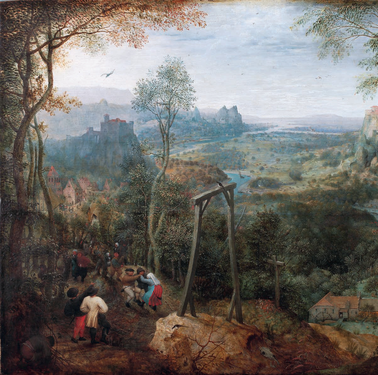 Одна из первых картин о военной травме в истории европейской живописи — «Сорока на виселице» Брейгеля. Она написана в 1568 году — за год до смерти художника и через год после начала жестокого подавления Нидерландского восстания герцогом Фернандо Альваресом де Толедо. Войны здесь как будто бы нет: мирный пейзаж, веселящиеся крестьяне, не обращающие никакого внимания на пустую виселицу. Это, конечно, не психологический этюд о безразличии к насилию, а аллегория — одна из брейгелевских картин-ребусов, соединяющая пословицу «дорога к виселице ведет через веселые лужайки» и распространенный образ сороки как сплетницы (а значит, доносительницы, готовящей почву террору). Виселица здесь напоминает невозможную фигуру, вроде треугольника Пенроуза,— перестраивающую геометрию мира и создающую дыру в самом его центре.