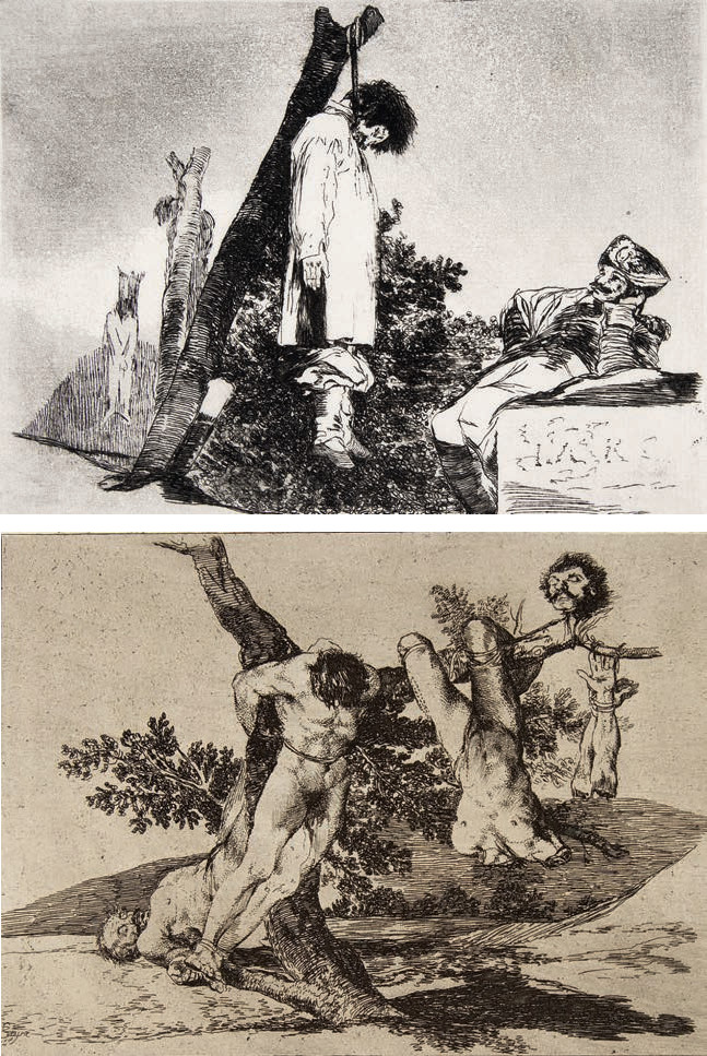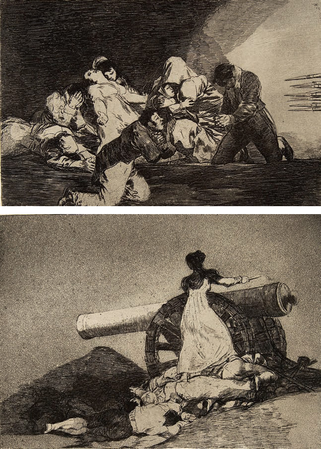 До начала XIX века войны были кровавыми, но не были массовыми. Они затрагивали сравнительно небольшую часть населения: профессиональных военных и тех, кому не повезло оказаться на их пути. Все изменила наполеоновская эпоха. Именно Гойя, с его чувствительностью к кошмару, был художником, который нашел способ зафиксировать эту перемену. Над серией офортов «Бедствия войны» он работал 10 лет — с 1810‑го по 1820‑й, но издана она была только в 1863 году — через 35 лет после смерти художника. Война здесь впервые в истории европейского искусства предстает не как упорядоченные, пусть даже страшные действия, а как хаотическая резня, стирающая всякие различия, кромсающая людей, превращающая их в чудовищ и их пищу. Мир «Капричос» из фантазии превращается в документальную реальность. Живописное осмысление того же опыта — в двух поздних монстрах Гойи, «Колоссе» и «Сатурне, пожирающем своего сына».