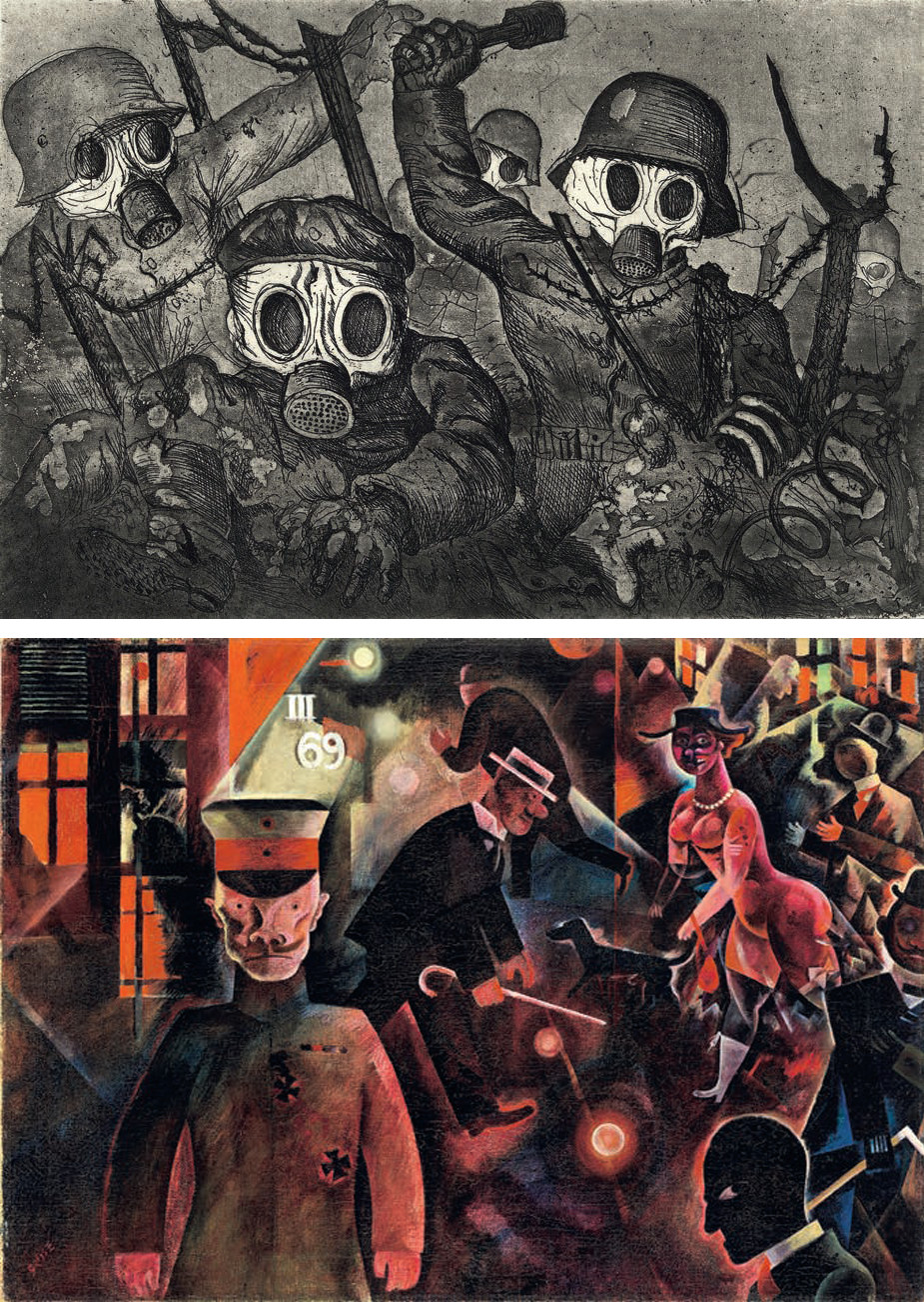 Немецкий экспрессионизм не был рожден войной, но был по-своему готов к ней. Его основой было ощущение мира распадающегося, способного каждую секунду обернуться вселенской катастрофой. В 1914 году катастрофа случилась, и Германия оказалась в ее центре. Многие из лидеров движения погибли на войне, другие вышли искореженными и начали пересобирать экспрессионистский язык, очищая его от авангардистской экзальтации, избавляясь от романтизма, чтобы разглядеть зияющую реальность. Именно постэкспрессионизм первым приходит в голову при речи об искусстве военной травмы: плакальщики Кете Кольвиц, гротески Макса Бекмана, карикатуры Георга Гросса, кошмары Отто Дикса. Эхо этой волны затронуло и советское искусство 1920-х, оно заметно, к примеру, в «Инвалидах войны» Юрия Пименова.