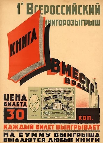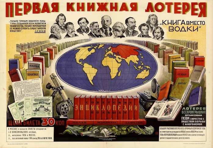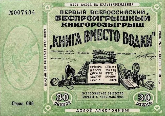 В 1929-м Общество борьбы с алкоголизмом объявило о Первом Всесоюзном розыгрыше «Книга вместо водки». По сути это была беспроигрышная лотерея, призванная привлечь внимание общественности к культурному досугу как альтернативе пьянок. За 30 коп. в газетных ларьках и книжных магазинах можно было купить лотерейный билет с цитатой из Ленина «Они (водка и прочие дурманы) поведут нас назад к капитализму, а не вперед к коммунизму» и получить по нему книгу или собрание сочинений на сумму от 25 коп. до 20 руб. в зависимости от выигрыша билета. На билетах было написано, что все вырученные от продажи лотерейных билетов деньги пойдут на поддержку культурных учреждений. Однако, судя по тому, что билетов было выпущено 2 млн, а заявленный призовой фонд составлял 600 тыс. руб., розыгрыш был самоокупаемым и главной его целью была пропаганда трезвости.