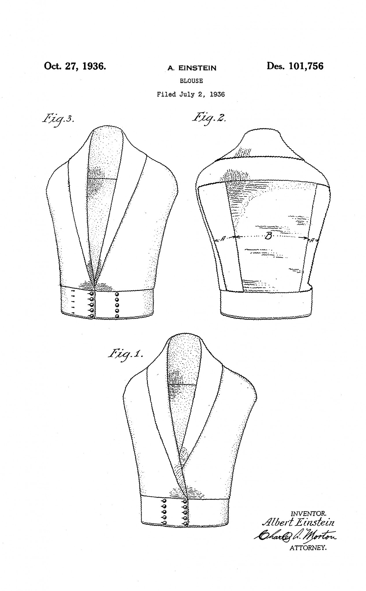 Альберт Эйнштейн придумал, как делать жакеты (пиджаки жилеты, блузы, кафтаны, пальто), которые будет впору людям любого телосложения. Собственно, изобретение состояло в системе застежек, расположенных последовательно по поясу и таким образом регулирующих ширину вещи. Эйнштейн даже сам сшил в качестве прототипа блузу без рукавов, оснащенную такими застежками. Он считал эту модель настолько революционной, что даже запатентовал ее дизайн. Тогда в массовое производство она так и не поступила, но принцип нескольких застежек, благодаря которым одежда становится шире или уже, нашел применение и широко используется — хотя и без ссылки на Эйнштейна.