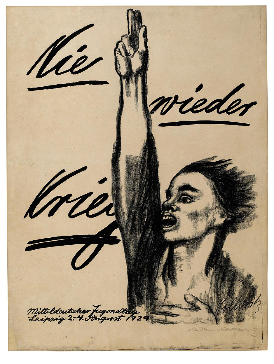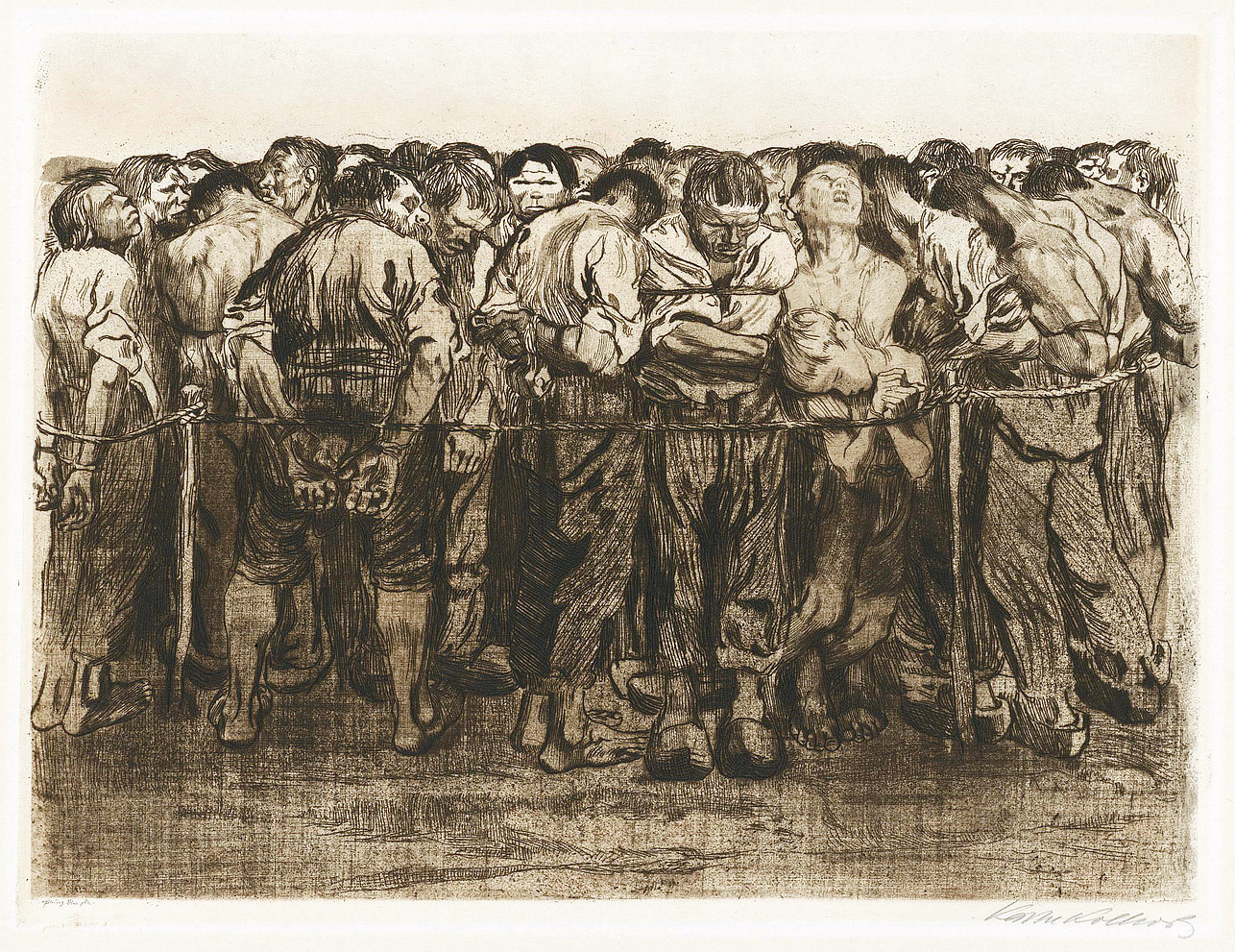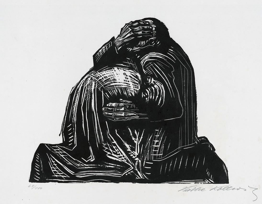 Феминистская история искусства убедительно доказывает, что женщине, чтобы завоевать себе место в мужском мире искусства, нужны какие-то особенно благоприятные обстоятельства, и у Кете Кольвиц они были — в виде семьи потомственной кенигсбергской интеллигенции самых либеральных взглядов, где ее желание стать художницей всячески поощрялось. К сорока годам ее, автора графических сюит «Восстание ткачей» (1893–1897) и «Крестьянская война» (1902/1903–1908), воспринимали как большого мастера, поднявшего немецкую печатную графику на те высоты, которых она достигала в эпоху Дюрера. До начала Великой войны карьера Кольвиц складывалась вполне счастливо, но война кардинально изменила ее жизнь и радикализировала искусство. В 1914-м Петер Кольвиц, подававший надежды художник, ушел добровольцем на фронт и погиб, восемнадцати лет от роду, в Первой битве при Ипре — она нашла в себе силы начать работу над памятником спустя месяц, но скульптурную группу «Скорбящие родители», которым приданы портретные черты Кольвиц и ее мужа, удалось установить на солдатском кладбище в Западной Фландрии лишь в 1932-м, помогло посредничество Альберта Эйнштейна, преодолевшего дружное