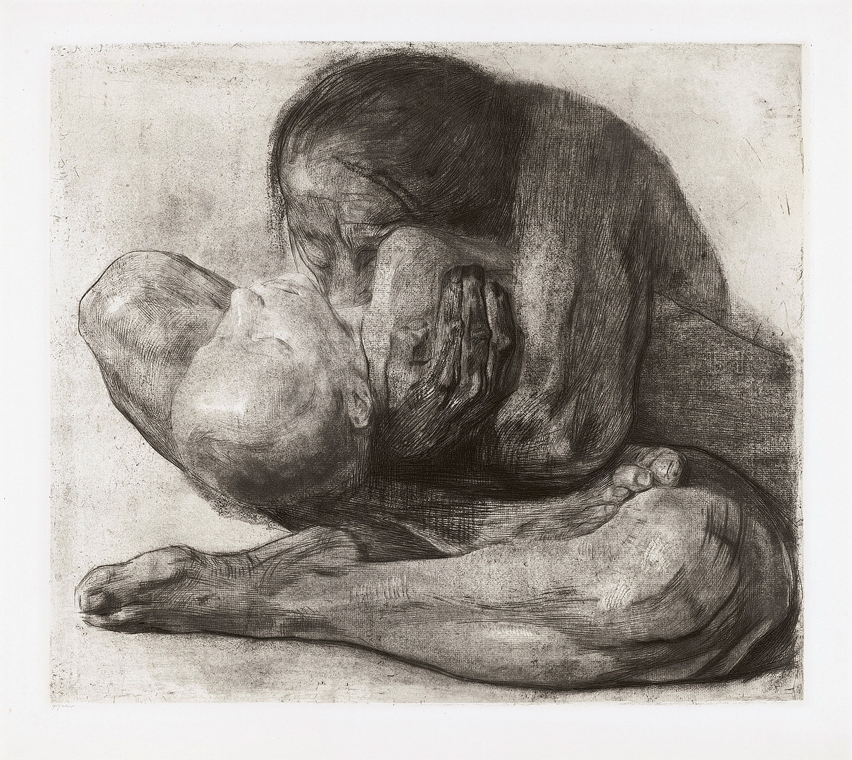 В Калининграде возле собора стоит небольшой — каменная стела с бронзовым барельефом — памятник Юлиусу Руппу, видному кенигсбергскому теологу, публицисту и политическому деятелю. Это одна из первых работ его внучки, великой немецкой художницы Кете Кольвиц (1867–1945). Вернее, это реконструкция ее работы, подаренная Калининграду в 1991 году: оригинальный барельеф был утрачен во время Второй мировой, а повторение сделал берлинский скульптор-реставратор Харальд Хааке. Ему же принадлежит увеличенная копия с так называемой «Пьеты» Кольвиц, скульптурной группы «Мать с мертвым сыном» (1937/1938), которую в 1993-м установили в шинкелевском «Нойе-Вахе» на Унтер-ден-Линден — теперь это главный германский мемориал жертвам войны и деспотии. Увеличенная, скульптура все равно кажется маленькой и потерянной в огромной классицистической пустоте здания караульни, но при этом она как будто бы заполняет все пространство немым, подавленным криком. Тема оплакивания возникнет в искусстве Кольвиц рано — задолго до глобальных исторических катаклизмов. В 1903 году она, счастливая мать двух чудесных мальчиков, одиннадцати и семи лет, работая над большой офортной серией о Крестьянской войне, вдруг награвирует лист «Женщина с мертвым ребенком»: обнаженная грузная туша в нечеловеческом, зверином отчаянии прижимает к себе хрупкое безжизненное тельце — моделями послужили сама художница и ее младший сын Петер. На вопрос старшего сына Ханса, откуда взялся этот образ, она позднее ответит, что это было предчувствие. Тема скорбящей матери всегда будет переплетаться в искусстве Кольвиц, вначале — гуманистическом и интуитивно антивоенном, впоследствии — программно феминистском, социалистическом и пацифистском, с темой милитаризма.