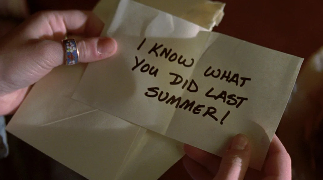 Кино «Я знаю, что вы сделали прошлым летом» — четверо подростков сбивают на машине незнакомца, сбрасывают его тело в реку, а спустя год получают письмо с угрозой: аноним знает, что они убили человека, и намерен теперь убить их всех — вышло в конце октября 1997 года.