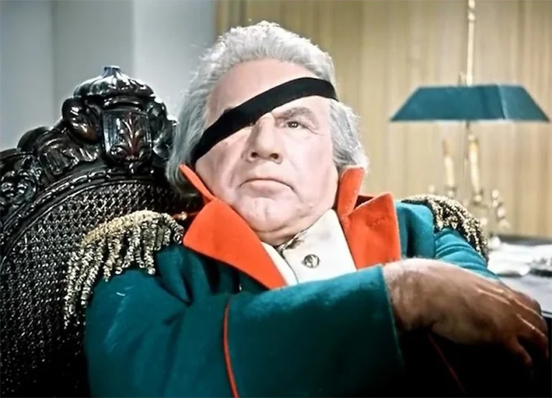 Впервые с повязкой на глазу Кутузов был показан в 1941 году в фильме Всеволода Пудовкина и Михаила Доллера «Суворов». Там в одной из сцен Суворов обращался к своему ученику Кутузову: «Мишенька, одноглазенький ты мой». Спустя два года Кутузова удостоили полноценным патриотическим байопиком, где полководец снова был представлен одноглазым и периодически появлялся в специальной повязке. На стадии сценария фильм разругали все, от Шкловского до Пырьева, зато после премьеры расхвалили Сталин, Черчилль и советские зрители, а повязка окончательно прикрепилась к образу главного героя войны 1812 года. На самом деле никаких исторических свидетельств о том, что Кутузов носил повязку, не сохранилось: по утверждениям историков, хотя Кутузов и правда был дважды ранен в голову с правой стороны, глаз чудом уцелел и даже частично сохранил зрение, поэтому повязка могла ему понадобиться лишь во время лечения. Тем не менее без повязки на экран Кутузова больше не пускали: и в комедийном мюзикле Эльдара Рязанова «Гусарская баллада», приуроченном к 150-летию войны 1812 года, и в недавнем эпике «1812: Уланская баллада», приуроченном к ее 200-летию, Кутузову стабильно прикрывали правый глаз повязкой, поддерживая его публичный образ.