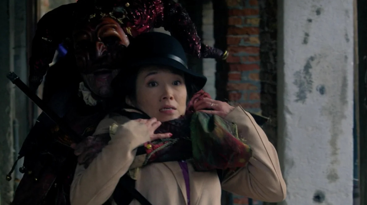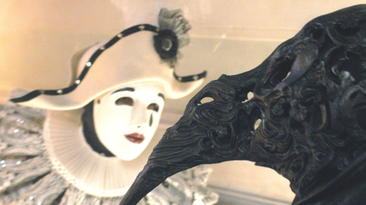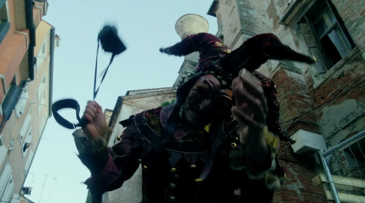 Тут, что называется, главное сохранять иронию и самоиронию, с этим у испанского автора все в порядке — свою историю о том, как паяц режет и рубит туристов прямо на палубе вапоретто, де ла Иглесиа начинает с изысканного дисклеймера: «Все персонажи и повороты сюжета в этом фильме вымышленные, хотя некоторые узнаваемые события, возможно, послужили авторам источником вдохновения». И, пообещав крупицы правды, кроит яростную вампуку из понятных самому широкому зрителю мифов. Если говорить о Венеции, то страшную изнанку этого блистательного города кинематограф на протяжении последних ста лет предъявлял довольно регулярно. Тут вспоминается и Пол Шрейдер с его «Утешением чужаков», где парочку туристов заманивали в свое палаццо страннейшие венецианские супруги в исполнении Кристофера Уокена и Хелен Миррен. Или «А теперь не смотри» Николаса Роуга, где лабиринты улиц и каналов сводили с ума героев Джули Кристи и Дональда Сазерленда. Или «Отель» Майка Фиггиса, где венецианские каннибалы расправлялись с зазевавшимися киношниками. Не говоря уж о Феллини или Висконти. Или о Кубрике — маскарад из «С широко закрытыми глазами» неизбежно всплывает в памяти, когда главные герои заваливаются на тайный бал и привратник требует у них пароль. За кадром звучит тревожное пианино в духе Дьёрдя Лигети.