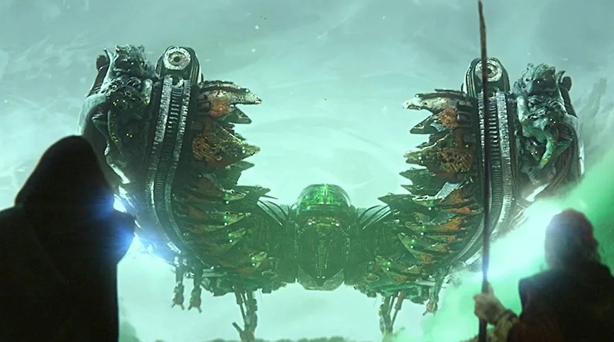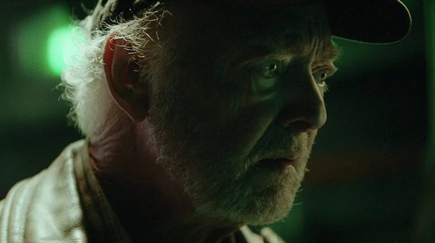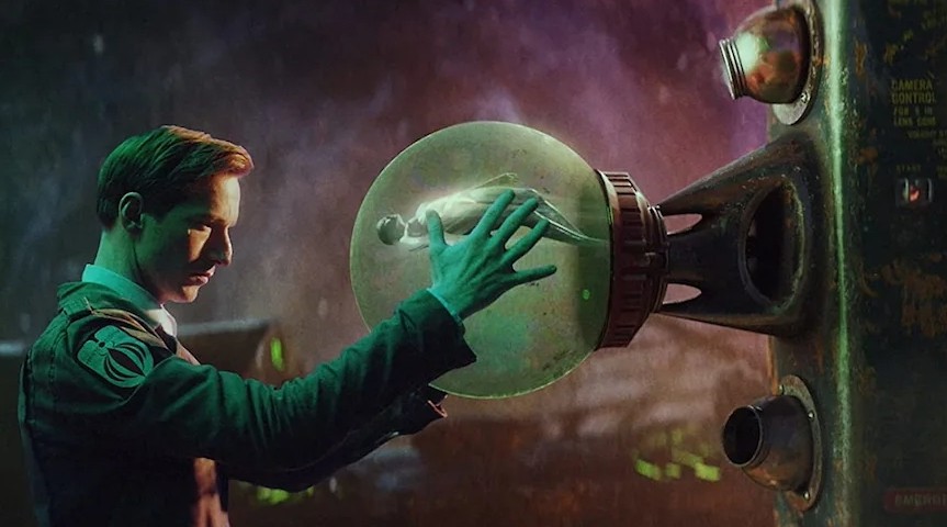 Это дикое по нынешним временам кино с первых кадров катапультирует зрителя с карантинного дивана в какой-то буро-малиновый ад. Полыхает застилающее экран неземное небо, и сияющий расплавленной сталью космолет падает на покрытую черной коростой поверхность планеты. Следом за ним, окутанный хлорно-зелеными облаками, ощетинившись акульей пастью приборов неясного назначения, на планету опускается корабль-охотник. Кажется, это его последняя победа — искусственный интеллект судна-преследователя, заточенный в металлическое тело, похожее на робота из «Метрополиса», барахлит и бессмысленно вращает глазами, пушки заедают. Так что космолет — на ручном управлении инвалидной команды: старого штурмана-сердечника, чуть что хватающегося за дефибриллятор, и молодого самоуверенного капитана в кожанке, похожего на очередное воплощение Саши Барона Коэна. Обоих зовут, как образцовых героев B-movie: штурмана — по-свойски, просто Лаго, капитана — звучной румынской фамилией Васкан. Вскоре Лаго и Васкану предстоит стать свидетелями настоящего чуда, уверовать и быть принесенными в жертву неведомому космическому божеству, имеющему вид голой женщины с перевернутым неоновым крестом на животе.