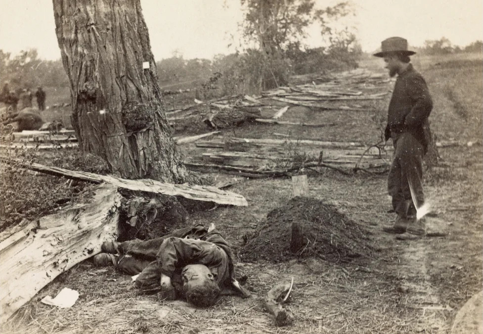 Первая фотография, опубликованная в прессе, на которой были запечатлены не просто солдаты и офицеры, военный лагерь или построения действующей армии, а прямое следствие войны — тела убитых солдат, появилась лишь спустя семь лет после публикации первых фотографий с фронта. Негласное правило не публиковать изображения изувеченных в сражениях тел нарушил американский журнал Harper’s Weekly. 18 октября 1862 года в нем был размещен разворот литографий, на основе восьми фотографий с поля боя при Энтитеме — одного из самых кровопролитных сражений в истории Гражданской войны в США и переломного для сил Севера. Фотографии были подписаны именем первого профессионального фотографа США Мэтью Брейди, но на самом деле сделал их не он.