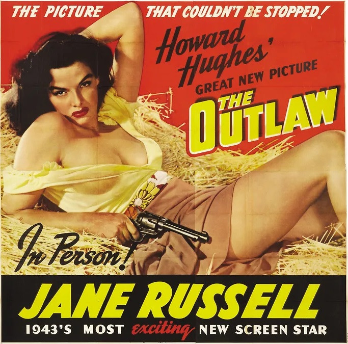 В 1941 году продюсер и режиссер Говард Хьюз заказал фотографии для афиши своего нового вестерна «Вне закона», где дебютную роль сыграла Джейн Расселл. В фильме ее героиня Рио становится жертвой насильника и возлюбленной двух главных героев. Сам Хьюз, впрочем, говорил, что главную роль в фильме сыграла не Расселл, а ее грудь: любивший эпатировать зрителя режиссер собственными руками сделал для Расселл специальный бюстгальтер из металлической проволоки. (Расселл потом говорила, что не смогла его носить, но Хьюзу не призналась, а просто подкладывала в лифчик тряпочки.) Впрочем на афише бюстгальтер не задействован. Фильм запретили бы и так, но, как сказал один цензор, «свисающая с афиши грудь» закрыла «Вне закона» дорогу к зрителю. Тогда Хьюз начал, как потом будут говорить, самую масштабную рекламную кампанию в истории Голливуда. Афиши фильма были распечатаны в виде пин-ап-открыток, которые стали расходиться тысячными тиражами и оказались в тумбочке буквально у каждого американского солдата. Снимок Расселл из той фотосессии для афиши даже опубликовал журнал Life. «Вне закона» стал известен без выхода на экраны — никто его не видел, но все хотели посмотреть,— и в 1943 году Хьюз выпустил его в обход цензурного комитета, просто арендовав кинотеатр в Сан-Франциско. Для большего эффекта по всему городу были без разрешения властей развешаны те самые рекламные плакаты с Расселл. И фильм, и плакаты продержались неделю, пока их не запретили как «изображение избыточной обнаженности». Рекламные плакаты к «Вне закона» стали коллекционной редкостью — на аукционах они продавались по $80 тыс.
