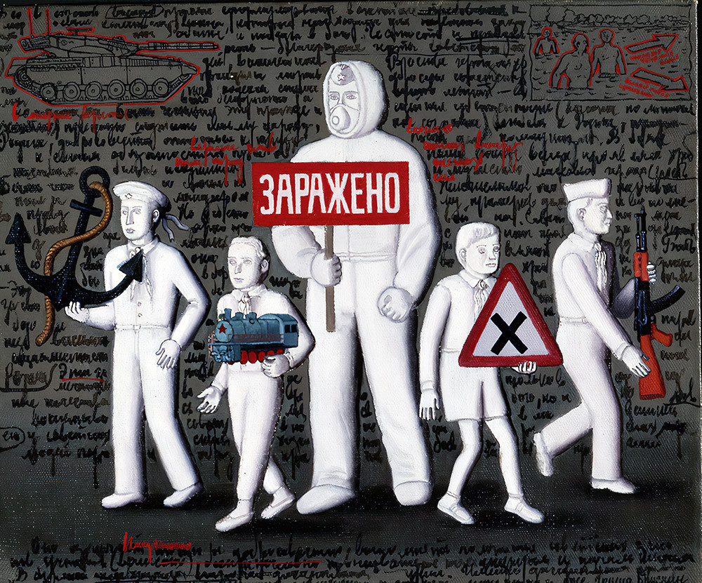 Поднявшись по лестнице, зритель попадал в темные комнаты с фирменными брускинскими фигурками, отбрасывающими жутковатые тени или же тонущими в монструозных видеопроекциях, и эти белые статуэтки-иероглифы разыгрывали вечный как мир спектакль на тему «Толпа и власть». Иероглифы складывались в своеобразный словарь мифологем тоталитаризма, символов насилия и подчинения — словарь этот, как всегда у Брускина, был составлен на материале языка всей мировой визуальной культуры, высокой и низкой, от Шумера и Аккада до советской парковой скульптуры и наглядных пособий по гражданской обороне. Прологом к спектаклю служила композиция с чудовищным идолом в виде механического двуглавого