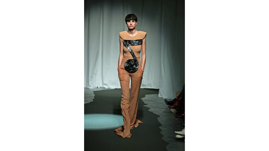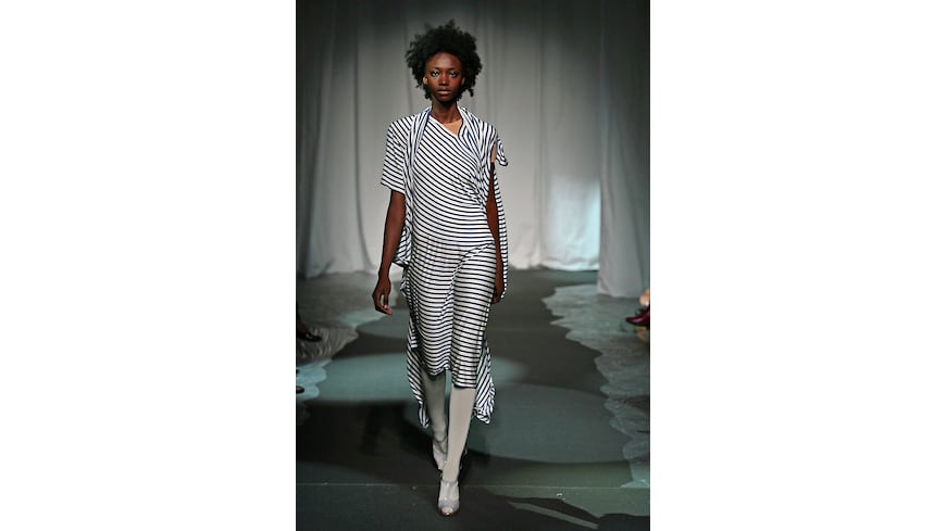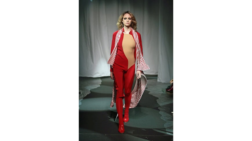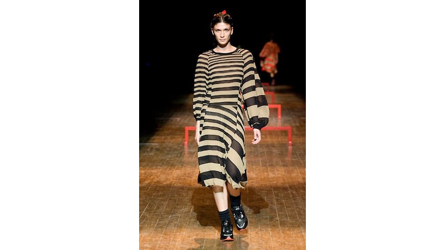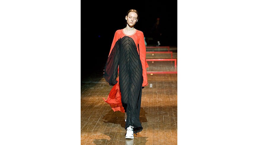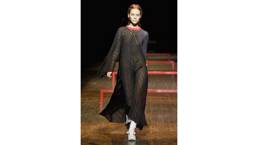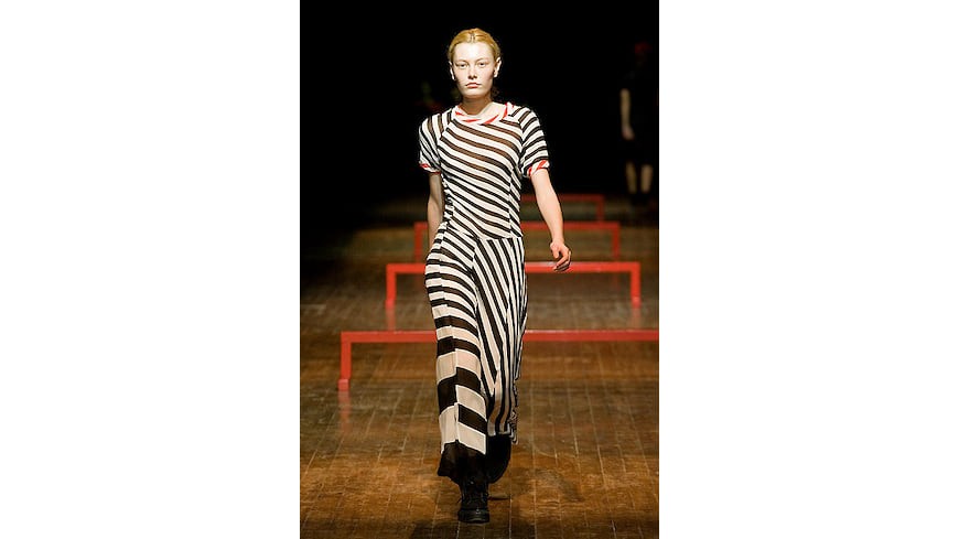 Дэвид Боуи возникает в этой истории еще раз — в коллекции Nina Donis SS 07. Возникает не самым ожидаемым образом, потому что, когда речь заходит о работе Нины Неретиной и Дониса Пуписа, вспоминают прежде всего о русском авангарде, о Малевиче, о Дейнеке,— это стало уже своего рода клише в разговорах о Nina Donis. Но Нина и Донис постоянно используют в своей работе куда более широкий спектр арт-референсов, где практически всегда есть современное искусство. Коллекция Nina Donis лета 2007 года, в красных и черных полосах, конечно, прежде всего заставляет вспомнить тот самый русский авангард, но, глядя на платье в черных поперечных полосах на бежевом фоне, где на одном рукаве их ширина увеличивалась, создавая как бы 3D-эффект, думаешь не столько о «Рабфаковках», сколько о той же «Зебре». Я специально спросила Дониса, что было в мудборде этой коллекции, и он ответил, что Дэвид Боуи и The New Romantics, а на мой вопрос, возникал ли в связи с Боуи оп-арт, он сказал: «Да, конечно, мы думали про оп-арт плюс киноплакаты братьев Стенбергов».
