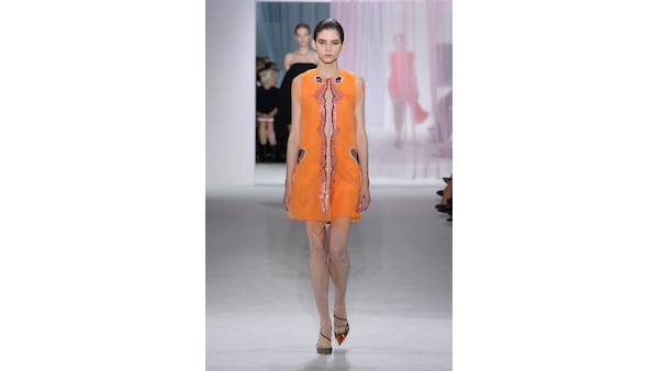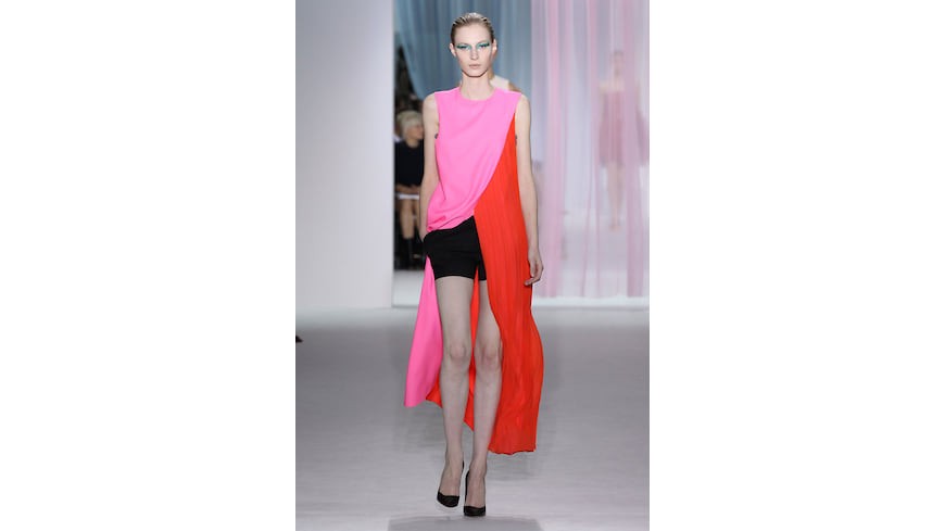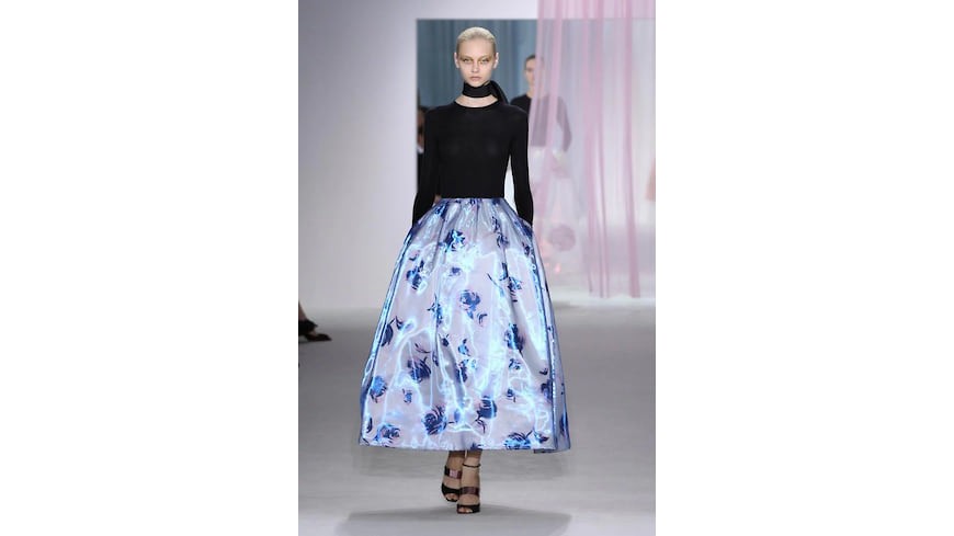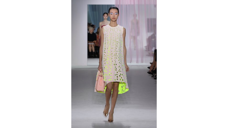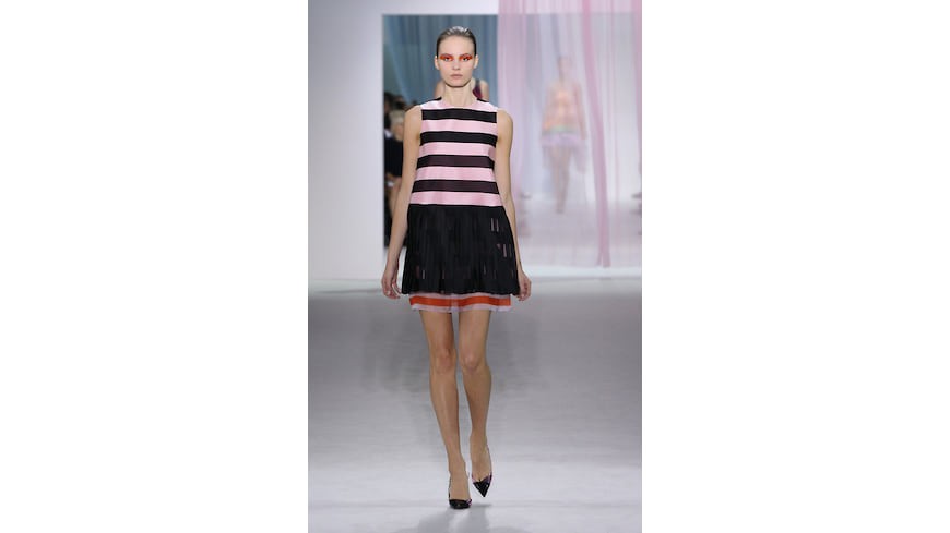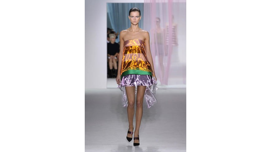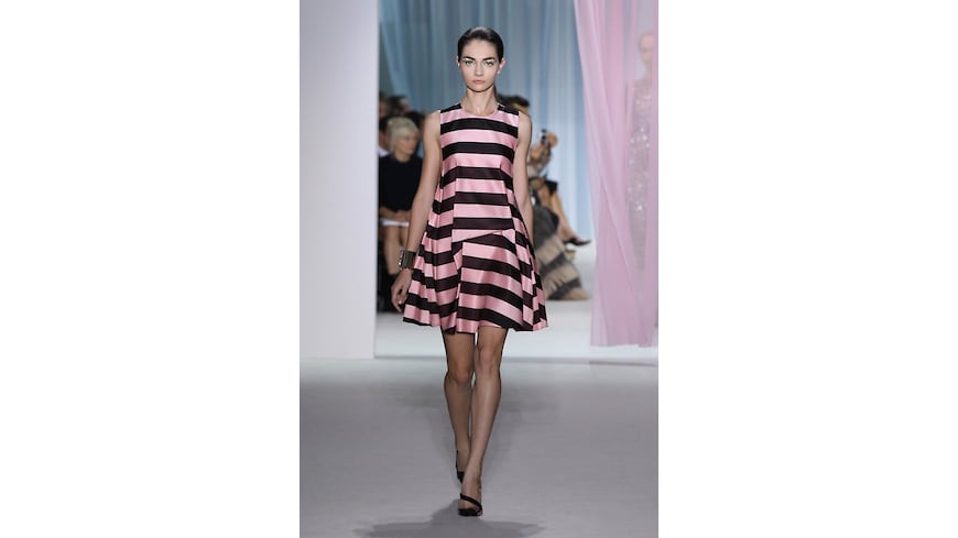 Раф Симонс всю свою карьеру дружит с художниками, собирает современное искусство и использует его в своих коллекциях. Только в самое последнее время у него были Мэпплторп в Raf Simons, Энди Уорхол (в том числе и его серия «American Flag») в Calvin Klein 205W39nyc, Стерлинг Руби в Christian Dior, в том же Calvin Klein 205W39nyc и даже в общей коллекции Raf Simons/Sterling Ruby. Но это именно прямое использование искусства в качестве принтов и коллаборация с художниками. Куда любопытней посмотреть на то, как искусство проникает в его работу самым неожиданным образом. В конце сентября 2012 года Симонс покажет свою первую коллекцию pret-a-porter для Christian Dior, «весна-лето 2013». В ней не будет никаких коллабораций и пока никаких арт-принтов, но она вся будет устроена так, что заставит вспомнить оп-арт. Во-первых, на показе будет звучать тот самый Шуберт, что играют герои-вампиры в фильме «Голод», Катрин Денёв и Дэвид Боуи, и Симонс отметит, что он большой фанат Боуи, и выбрал эту музыку специально. За Боуи, конечно, сразу встают его самые знаменитые сценические образы, и прежде всего его полосатые костюмы Ziggy Stardust. Это вспомнится, когда на подиум выйдут модели в переливающихся радужными полосами нарядах, когда появится розовое платье в широких черных полосах с подкроем и драпировками, создающими при движении оптический эффект перетекания вертикалей в горизонтали. Но самый интересный эффект будет связан с ударными луками — тонкими черными трикотажными топами с кринолинами из шелка-дюшеса в огромных цветах. Обойдясь без всякой геометрии и оптических эффектов, только фактурой ткани и сочетанием цветов и объемов, Симонс добьется того, что эти кринолины будут выглядеть, как сферы, испускающие сияние и меняющие цвет,— казалось, что их принт меняется в реальном времени, как на дисплее. По сути, это были игры с нашим зрением и мозгом, которым оп-арт научил всех — только на другом материале.