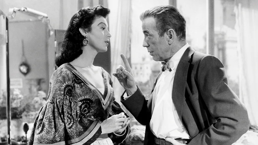 В этом фильме у него уже обнаруживается характерная полустарческая усмешка (обратите внимание, как он разводит руками на тридцатой минуте) и общее комедийное начало, которое в полной мере раскроется в хьюстоновской «Африканской королеве» (1951). Здесь перед нами предстает уже перевернутый Богарт. Он страдает похмельем, у него бурчит в животе, его мимика не в пример живее, чем в прошлых фильмах, нигде на экране он так не хохочет, как здесь, он юродствует и активно передразнивает бегемота и обезьян (за эти сцены он, надо полагать, и получил «Оскара»). Кроме того, здесь уже им самим помыкает женщина (Кэтрин Хепбёрн) — в частности, выливает в реку все его запасы джина (немыслимая сцена для Богарта сороковых). Но опять же здесь есть благородная линия постороннего, который вписался.