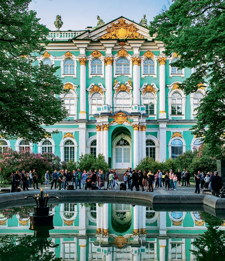 В XVIII веке заказчица проекта — императрица Елизавета Петровна — приказала архитектору Бартоломео Франческо Растрелли выкрасить здание в теплый охристый с белым декором. Тот же Растрелли придумал загородить печные трубы на крыше 176 скульптурами, установленными на карнизе. При следующих правителях дворец постепенно темнел, а Николай II распорядился выкрасить его в розовый (по его первоначальному плану — в кирпично-красный, но в итоге решили не подливать масла в огонь революционных настроений и осветлили). Большевики в 1920‑х рискнули сделать Зимний дворец оранжевым, а война вынудила замаскировать его фальшфасадами. Привычный сегодня зелено-синий цвет здание приобрело уже после Великой Отечественной войны, в 1947 году.