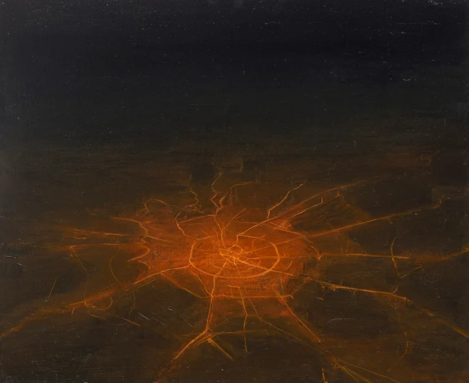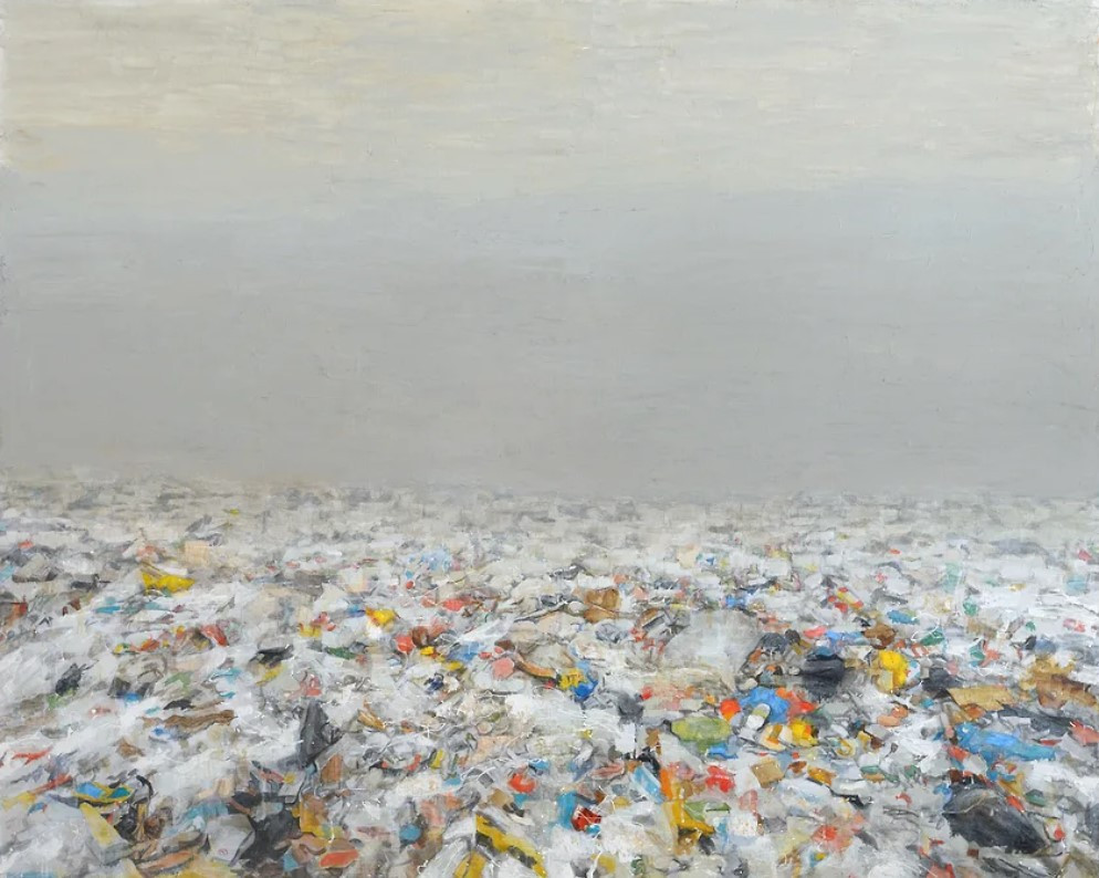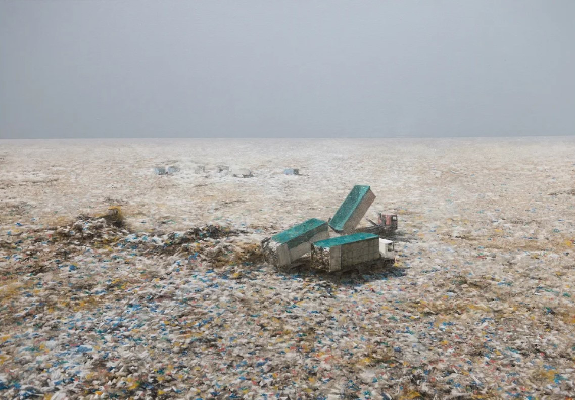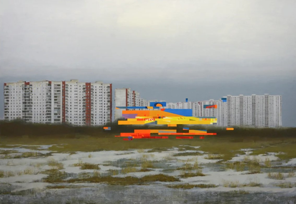 На счету пейзажа по крайней мере две великие революции в искусстве, ренессансная и импрессионистическая, и в обоих случаях он служил инструментом открытия реальности, предлагал новую перспективу. По словам Отдельнова, новая перспектива открылась ему, когда он совершил восхождение на гору Долгопрудненского полигона твердых бытовых отходов. Пейзаж «Пустыня» (2010), написанный под впечатлением от увиденного, как в зародыше, содержал в себе все, что позже развернется в живописные циклы и инсталляции. Это была простейшая композиционная схема «земля — линия горизонта — небо», напоминающая абстракции Марка Ротко. Это был отстраненный взгляд сверху, напоминающий механистичность съемки для Google Maps. Это была периферия, где-то между городом и областью, лиминальная зона, не-место, в котором жизнь подвисает и которое стремишься поскорее преодолеть, не замечая, что жизненная ткань и состоит из таких преодолений. Это была земля, до горизонта покрытая мусором,— экология вскоре сделается одной из главных тем в искусстве Отдельнова, и в проекте «Говенное море» (2019–2020) он вернется к мусорному вопросу, представив живописно-кинематографическую одиссею московских бытовых отходов. Другим откровением оказались фотоинструменты Google, при помощи которых можно было взглянуть на Землю нейтральным, объективным, нечеловеческим взглядом камеры-робота. Серия «Color fields» (2010) была вдохновлена картами Google, действительно похожими на картины американских абстракционистов «живописи цветового поля», что и обыгрывается в названии: увиденные из космоса поля, города в дорожных петлях, промзоны, парковки составляли ритмически и колористически