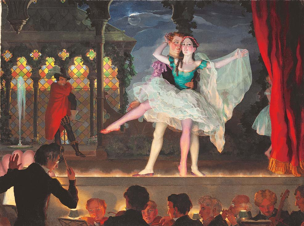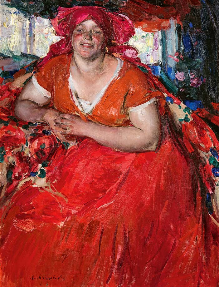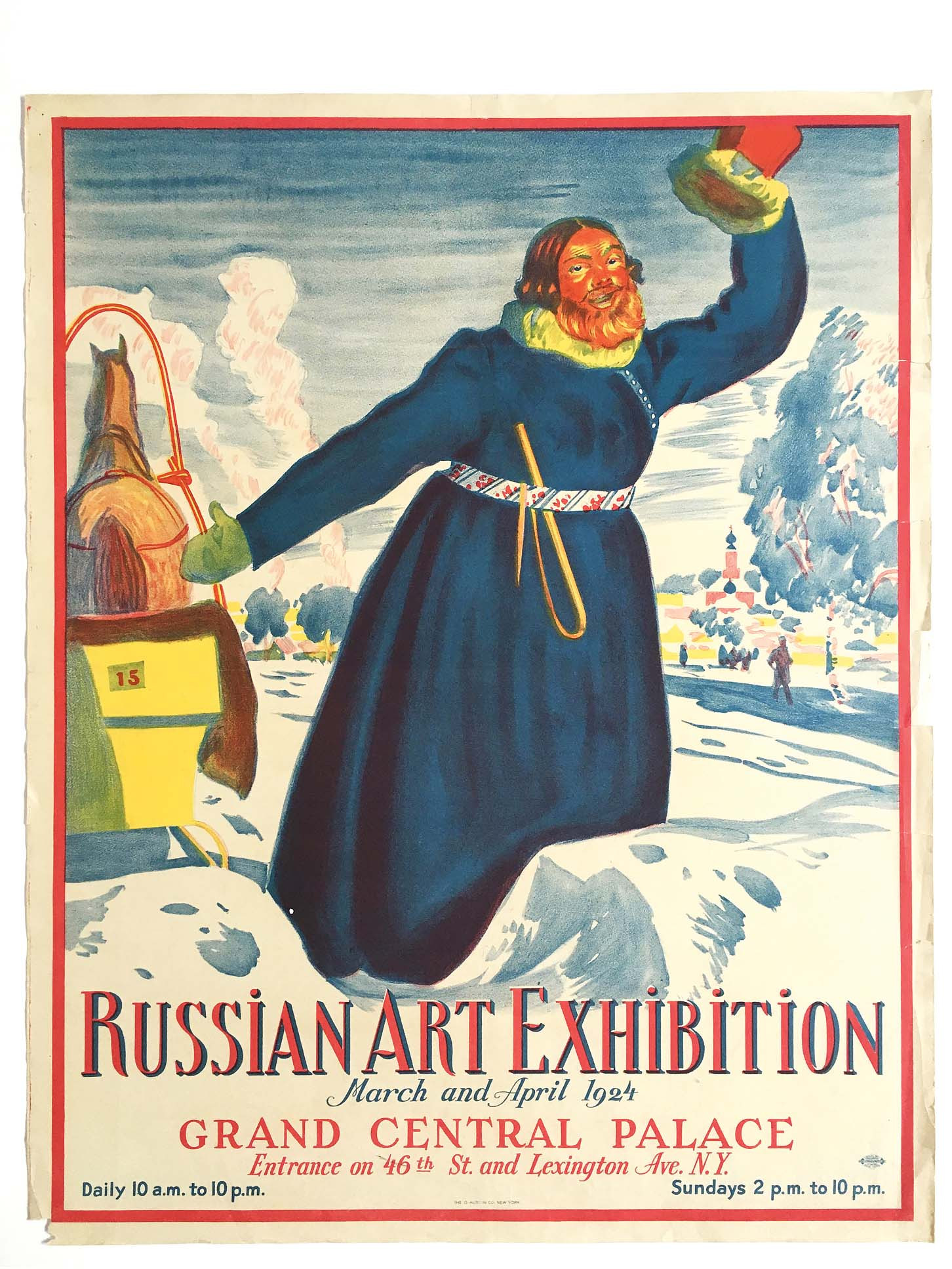 С афиши «Russian Art Exhibition» публике, пришедшей 8 марта 1924 года в Гранд-Сентрал-палас, выставочный центр на Манхэттене, радостно махал кустодиевский ямщик-лихач, приглашая в сани, запряженные каурой лошадкой, чтобы помчаться по глубоким синеватым снегам — мимо церквушки с луковичными куполами и приземистых изб, трубы которых выбросили в морозное небо столбы красноватого дыма. Это была честная, правдивая афиша, предъявлявшая товар лицом: сани, снега, ямщики, церквушки, монастыри, кремли, крестные ходы, избы, деревни, базары, старые усадьбы, елки, маскарады, тургеневские барышни, крестьянские девки, балерины в пачках, натурщицы каменнобабских форм, женщины с иконописными ликами, чудное приволье, нивы и поля — Holy Russia, как есть Holy Russia. Этот же ямщик встречает и публику «Других берегов», но называние подсказывает, что поездка нам с ним предстоит заграничная: из 2021 года американская выставка 1924 года представляется чем-то вроде художественного аналога «философского парохода». Дело, конечно, не в том, что ряд художников, командированных в США для устройства выставки, не вернулись в СССР — например, сделавший афишу с ямщиком по кустодиевским мотивам Федор Захаров (среди невозвращенцев были и более крупные фигуры, такие как Константин Сомов и Сергей Виноградов). И не в том, что значительная часть экспонентов — либо незадолго до, либо вскоре после американской выставки — оказалась в эмиграции. Просто вся необъятная «Russian Art Exhibition» предъявляла Соединенным Штатам такое искусство, в каком Страна Советов 1924 года совсем не нуждалась (и характерно, что многое, проданное с той выставки, стало возвращаться в частные российские коллекции лишь начиная с 1990-х). Здесь современный зритель, особенно тот, кто успел посмотреть выставки к 100-летию ВХУТЕМАСа, с изумлением обнаружит, что ни «Бубновый валет» в лице Петра Кончаловского, Ильи Машкова и Аристарха Лентулова, ни сам Михаил Ларионов не являются в 1924 году авангардом и что все они замечательно соседствуют со своими былыми врагами, с «Миром искусства» и «Союзом русских художников». Что вообще-то единственный на американской выставке авангардист в новом советском понимании — это Кузьма Петров-Водкин со своей планетарно-космистской перспективой и прочими историософскими прозрениям, но его брейгелевская «Ретроспектива» и иконное «Желтое лицо» вряд ли могли быть прочитаны в этом контексте.