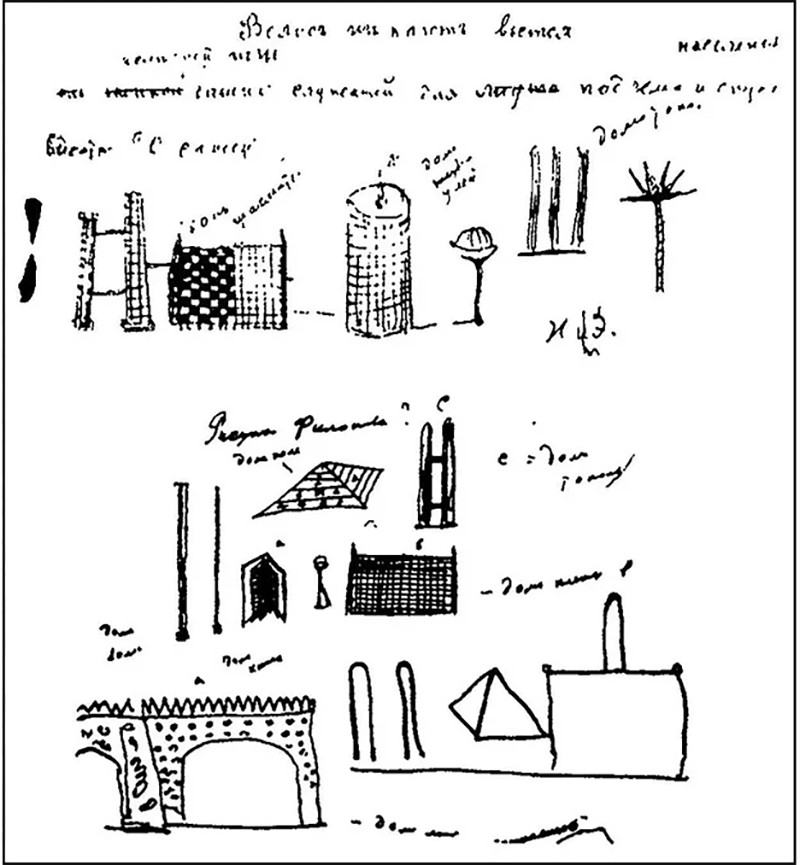 «Я почувствовал скрип и покачивание. Это железная цепь подымала меня вдоль дома-тополя; мелькали клетки стеклянного плаща и лица. <…> Я вышел на мостик. Изящный, тонкий, он на высоте 80 сажен соединял два дома-тополя. <…> Вдали, между двух железных игл, стоял дом-пленка. 1000 стеклянных жилищ, соединяемых висячей тележкой с башнями, блестели стеклом. Там жили художники, любуясь двойным видом на море, так как дом иглой-башней выдвинулся к морю. Он был прекрасен по вечерам. Рядом на недосягаемую высоту вился дом-цветок, с красновато-матовым стеклом купола, кружевом изгороди чашки и стройным железом лестниц ножки. <…>. Железные иголки дома-пленки и полотно стеклянных сот озарялись закатом. У угловой башни начинался другой протянутый в поперечном направлении дом. Два дома-волоса вились рядом один около другого. <…> Роща стеклянных тополей сторожила море».