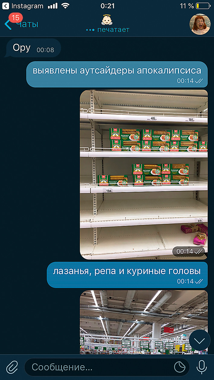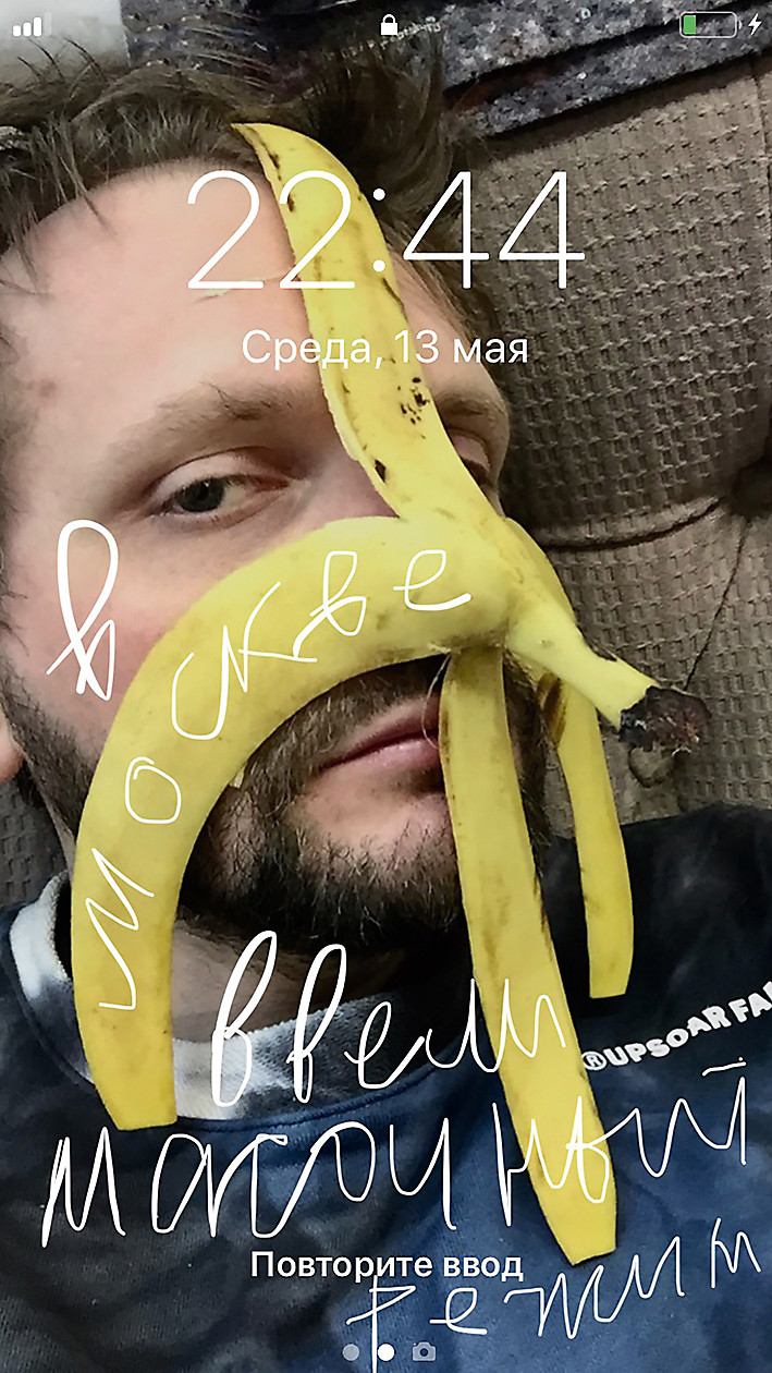 Три работы на выставке пользуются самым большим зрительским успехом. Во-первых, инсталляция Ани Желудь «Схема пространства элементарного счастья»: типовая комната, вся прозрачная обстановка которой — кровать, стол, стул, платяной шкаф с одеждой, коврик на полу и картина на стене — нарисована в пространстве черным металлическим контуром. Во-вторых, инсталляция Игоря Самолета «Проснулся уже уставшим»: россыпь фото- и видеообъектов, вдохновленная процессом сетевой коммуникации, от мессенджеров до инстаграм-сториз, и показывающая, что экран смартфона — вообще и особенно в дни карантина — стал нашим новым окном в мир. В-третьих, инсталляция Тимофея Парщикова «Sad.O.K.Super»: еще один карантинный фотодневник в виде мозаики из разноразмерных негативов в жовто-блакитной гамме, впрочем не несущей никакого политического подтекста,— просто художник применил какойто фильтр, усиливающий микроконтрасты для слабовидящих. Тимофей Парщиков, сын поэта Алексея Парщикова, чей стих из поэмы «Деньги» дал имя выставке, даже выигрывает у Ани Желудь и Игоря Самолета — по крайней мере, очередь из парочек инстаграмеров — один/одна позирует на фоне работы, другой/другая снимает — к его инсталляции самая большая. Морализаторы-консерваторы скажут, какой же это зрительский успех, если один зритель повернут к произведению задом, а другой смотрит не столько на произведение, сколько на позирующего и через объектив. Долой консерватизм: инстаграмабильность — важнейший эстетический параметр работы в эпоху партиципаторности искусства. И если когда-то дурным тоном художественной критики считалось обращать внимание на «простого зрителя», цитировать его замечания и описывать реакции, то сегодня это уже не так. Да и сам жанр пандемической выставки предполагает и эту зрительскую эйфорию от выхода в офлайн, и бесконечный круговорот офлайна и онлайна в природе.