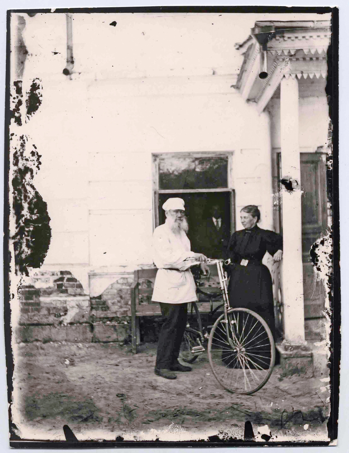 Лев Толстой учился ездить на велосипеде в Манеже. Там он часто сталкивался с полной дамой в шляпе с перьями и тоже на велосипеде. Лев Толстой ничего с собой не мог поделать и каждый раз, видя, как колышутся перья на ее шляпе, устремлялся за ней. Дама визжала и пыталась удрать, но Толстой всегда догонял и, если не успевал соскочить с велосипеда, врезался и опрокидывал ее на землю.
