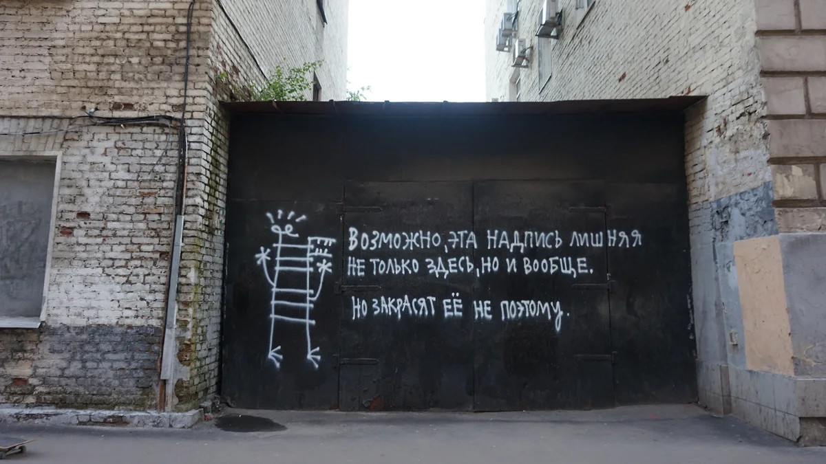 Уличному искусству учатся на улице и у улицы — в биографиях Кирилла Кто (в миру — Кирилл Лебедев) обычно пишут, что никакого специального художественного образования у него нет, да и сам художник бравирует тем, что не то что институтского диплома, но даже школьного аттестата предъявить не может, хотя родился и вырос в «советской Силиконовой долине», городе ученых и инженеров Зеленограде. И все же одну школу, художественную, он закончил — вряд ли кто-то способен догадаться, что фломастерный рисунок с текстовой композицией «Сложно извинить, еще сложнее изменить» (2022) сделан рукой не просто натренировавшейся в теггинге, но знающей, как работать в гипсовом классе и на пленэре, однако компоновка и цвет здесь не дикорастущего, а культурного рода. Особенно цвет — порой изнанка какого-нибудь афишного стенда с фирменной «пуговицей» выглядит совершенно неуместной «данью почтения Василию Кандинскому» посреди типичного городского не-места, а со стены, на которую не без помощи художника отбросили огромные голубые тени банальная оградка газона с вентиляционной тумбой («Рисование того, что за спиной», 2012), нам подмигивает «всего лишь глаз» Клода Моне. В художественную школу его привела мама, обычный зеленоградский инженер-электронщик с необычной любовью к современному искусству: ее роман начался с регулярных поездок в Москву на выставки (самое раннее из выставочных впечатлений Кирилла Кто — Жан Тенгели в ЦДХ, увиденный будущим художником в пятилетнем возрасте) и вылился в собственные опыты в мозаике и витраже (в галерее Triangle на «Винзаводе» прошли уже две совместные выставки сына и матери, знаменитого стрит-артиста Кирилла Кто и начинающего дизайнера Татьяны Будяк). От учителей в художке будущая знаменитость узнала, что нужно ездить в Москву и смотреть, что выставляют настоящие художники на Крымской набережной, от одноклассника — что граффити значит гораздо больше, чем писать на стенах, что это целый мир хип-хоп-культуры, но как попасть в этот мир — неизвестно. Выставлявшееся на Крымской набережной не могло произвести впечатления на тинейджера, впечатление произвела выставка московских концептуалистов по соседству, в ЦДХ — вещи Андрея Монастырского, Натальи Абалаковой и Анатолия Жигалова, Юрия Альберта: текстовая картина последнего «В моей работе наступил кризис. Я смущен, растерян и не знаю, что теперь делать» (1983), где не было ничего, кроме этого иронично-чистосердечного признания, показалась откровением. Первыми опытами граффити-самодеятельности стали цитаты из Маркеса, Борхеса, Макса Фриша и Виктора Цоя, написанные маркером на стенах в зеленоградских подъездах, которые в 1990-х не запирались. Первыми проводниками в мир хип-хопа стали культовые радиостанции, культовое кино вроде «Столкновения» Дэвида Уинтерса или «Ненависти» Матье Кассовица, культовые журналы вроде «Птюча» и «Посмотри» и, главное, ролики — субкультурные поля роллеров, скейтеров и райтеров накладывались друг на друга.