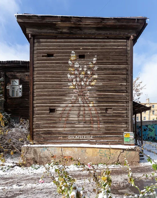 Впрочем, тот круг нижегородского уличного искусства, к которому принадлежал Филатов, был далек от агрессии, хотя работал в агрессивных обстоятельствах времени и места: живопись возникала там, откуда уходила жизнь, где деревянная по преимуществу жилая историческая застройка Нижнего исчезала — ввиду ветхости, расселения и наступления девелопмента по всем фронтам. Вначале художники улицы выбирали романтические руины заброшенных и полусожженных домов скорее из прагматических соображений — чтобы работать при свете дня без непрошеных свидетелей. Однако постепенно эти практики переросли в сотрудничество с местными жителями и приобрели градозащитный характер: хотя стрит-арт принято связывать с образом вандала, нижегородское уличное искусство как раз противостояло вандализму строительного капитала, призывая сохранять и восстанавливать городскую ткань. Манифестом движения стал фестиваль уличного искусства «Новый город: Древний» (2014–2016), придуманный и организованный Филатовым: все работы — в соответствии с Жилищным кодексом РФ — согласовывались с жильцами домов, и городская администрация была вынуждена их визировать. Еще одним кураторским проектом Филатова, в котором встретились уличное искусство, краеведение и градозащитная повестка, стала выставка «Обратно домой», устроенная в 2017 году в Музее нижегородской интеллигенции (до 1993 года — музей-квартира сестер Невзоровых, связанный с Лениным и историей газеты «Искра»): вызывая революционных духов этого многослойного места, художники оживляли квартал опустевших деревянных домов, окружающий выселенный музей.