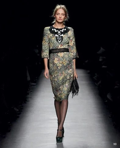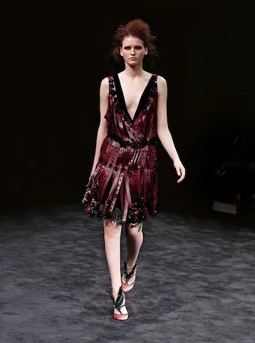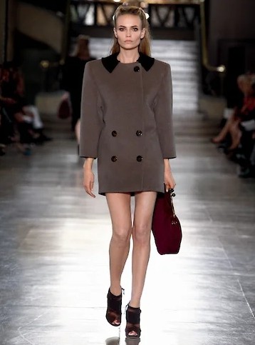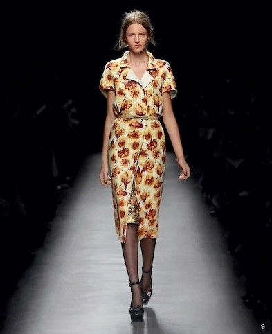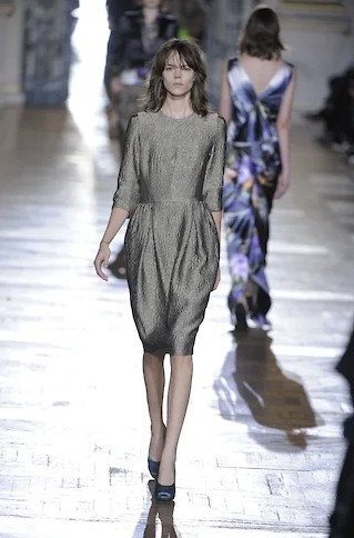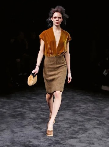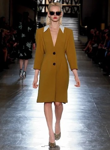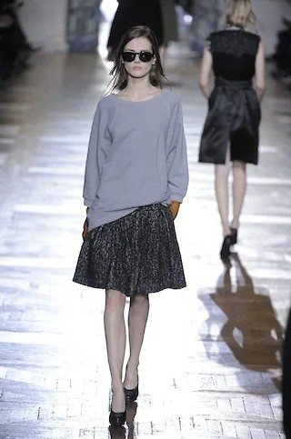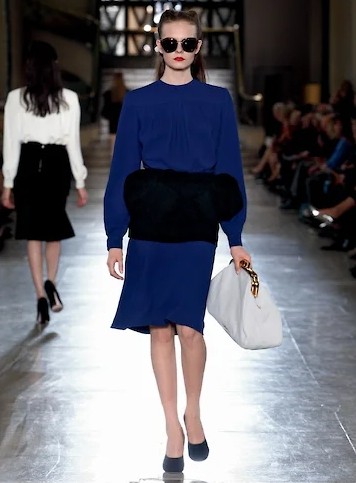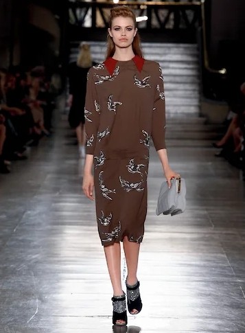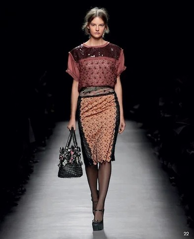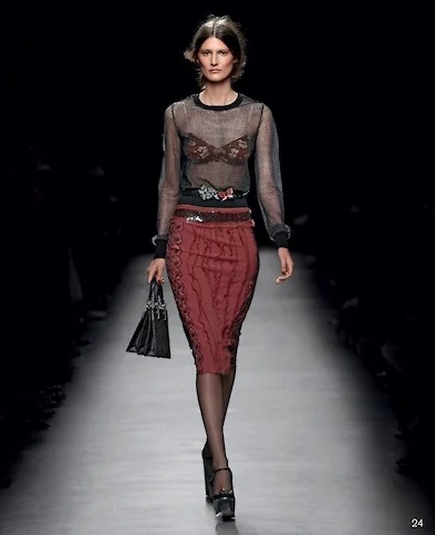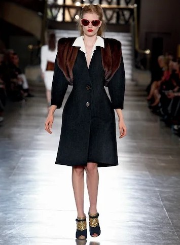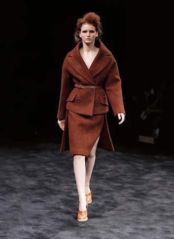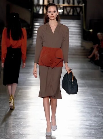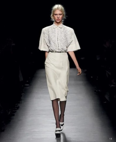 В коллекции Miu Miu «осень-зима 2011», показанной через два года, плечи останутся широкими, но силуэты при этом будут более женственными. Главным станет классическое платье 40-х — широкие прямые плечи и драпировка на бедрах. Их Прада сделает и однотонными, и в набивной ткани с букетиками ландышей и ласточками, и с вышитыми птичками и цветочками. В качестве драпировки будут выступать широкие, перекрученные норковые накладки, норка же появится и на плечах, имитируя меховые горжетки совершенно в духе той эпохи. Эти девушки будут напоминать уже о «Последнем метро» Трюффо, где богемно-буржуазная героиня Катрин Денёв спасает своего мужа и свой театр в оккупированном Париже ровно в таких же платьях и пальто. Одна из лучших коллекций Miu Miu — и самая настоящая ода 40-м. Тут Прада практически только воспевает эпоху, почти не предаваясь свой любимой игре с ностальгическим и суперсовременным.